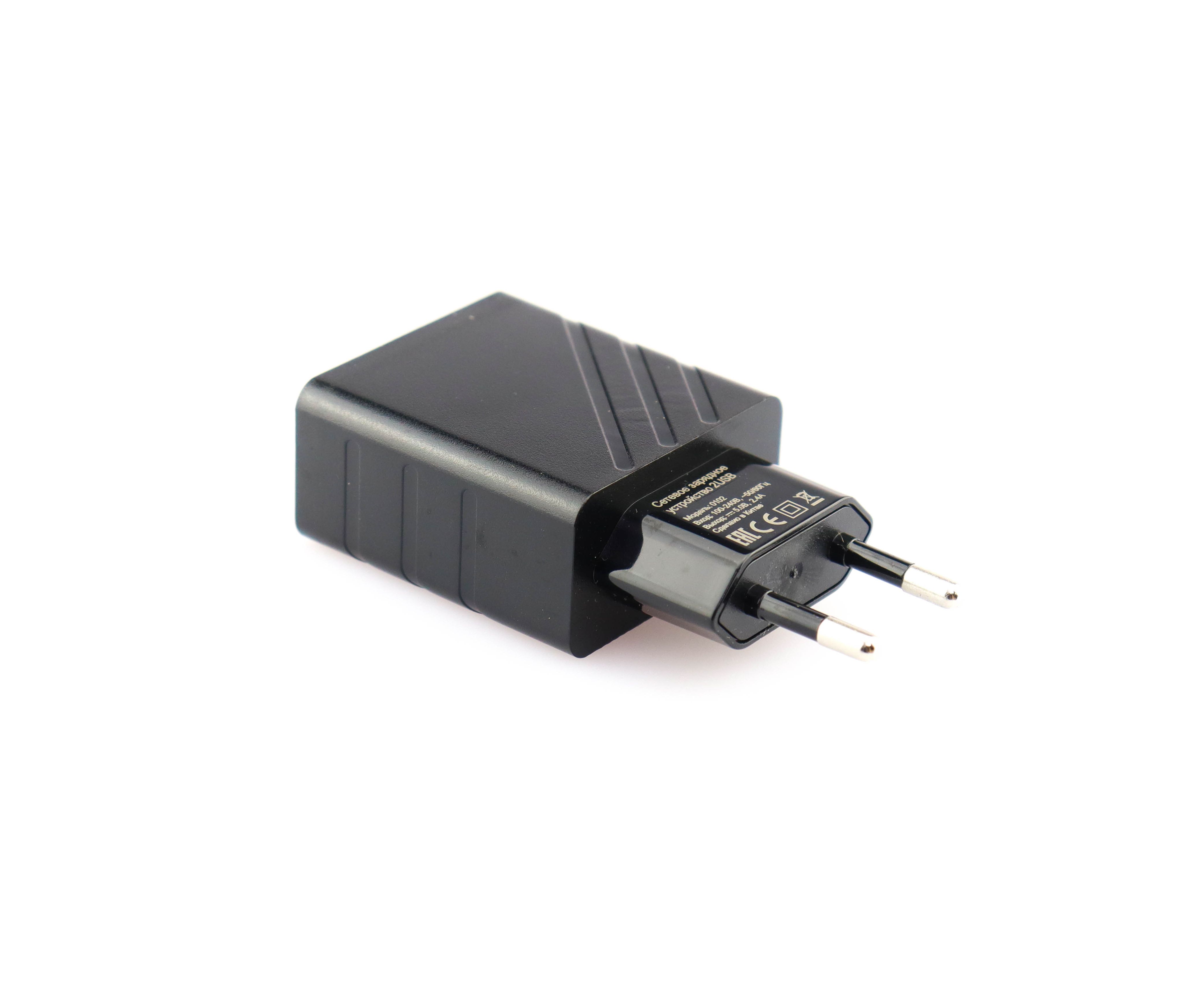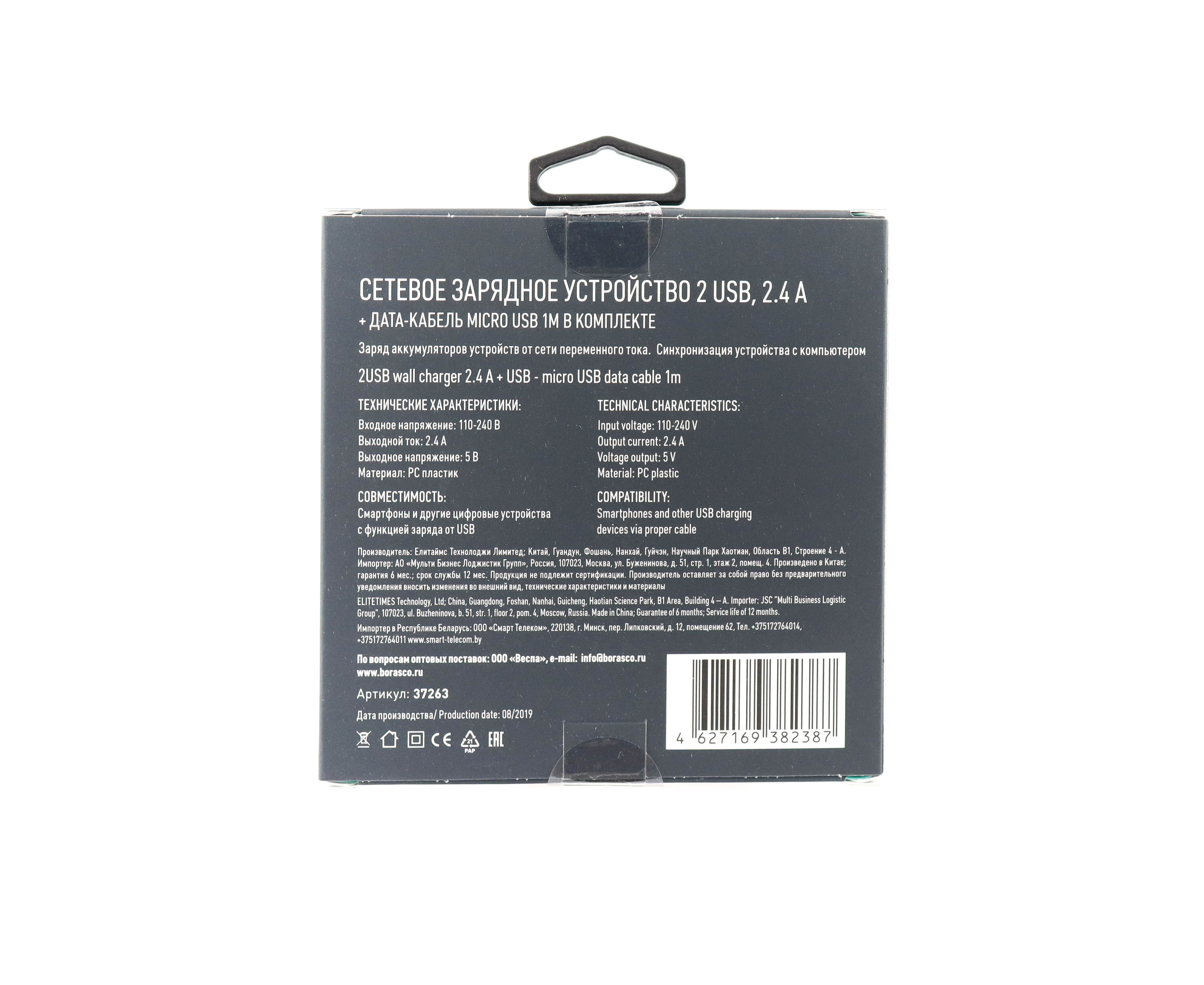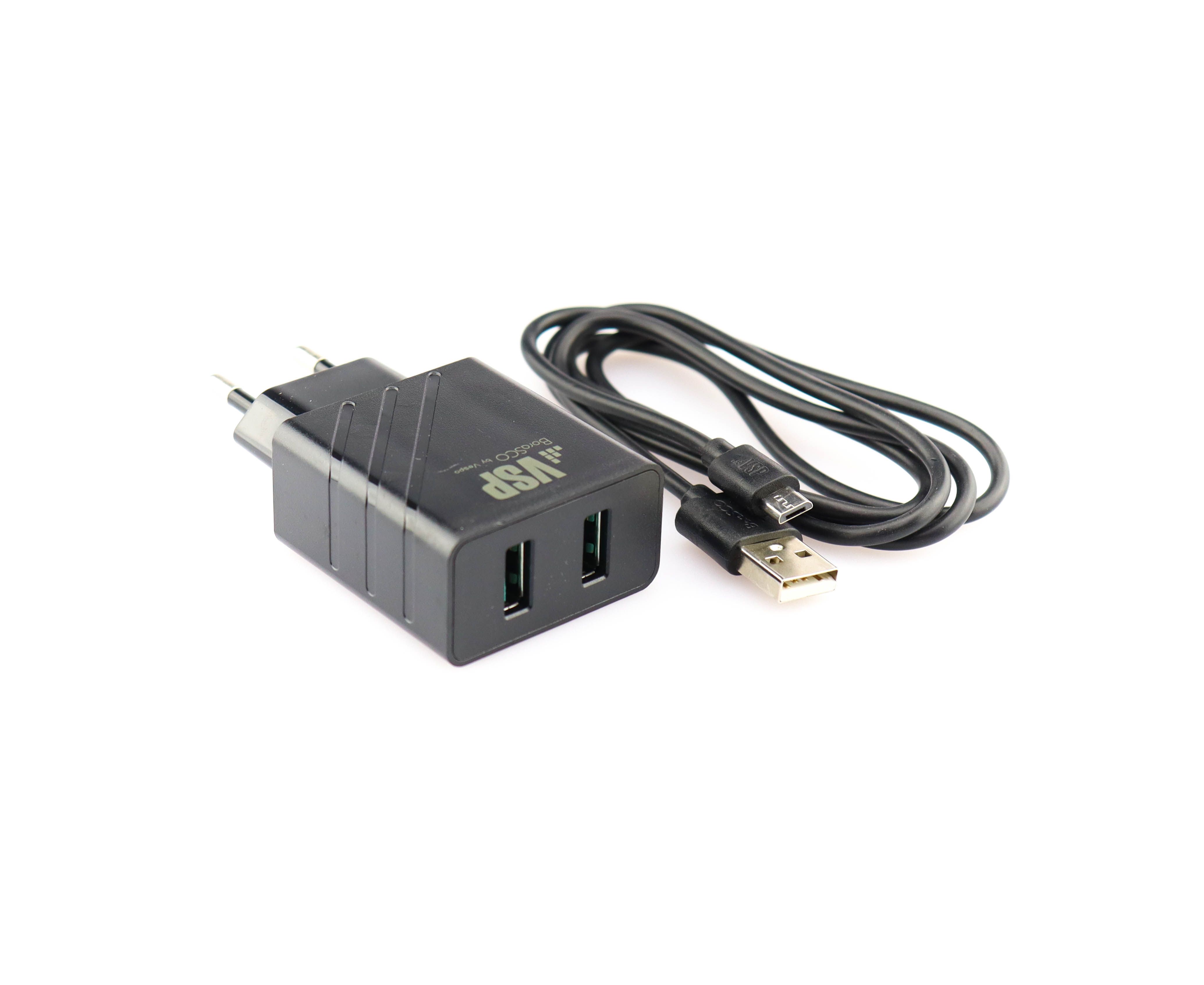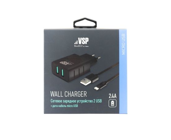 Сетевое зарядное устройство 2 USB, 2,4A + Дата-кабель micro USB, 1м, черное, VSP (BoraSCO)