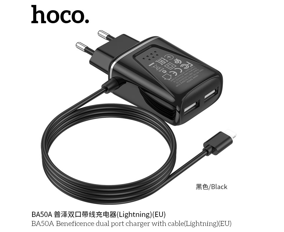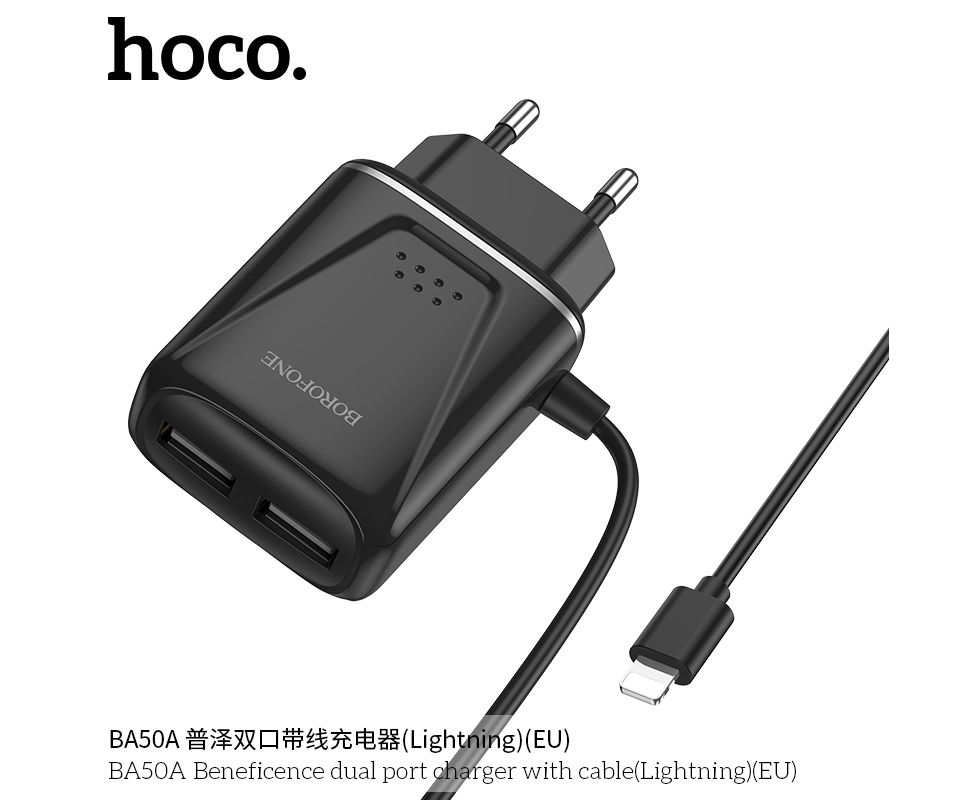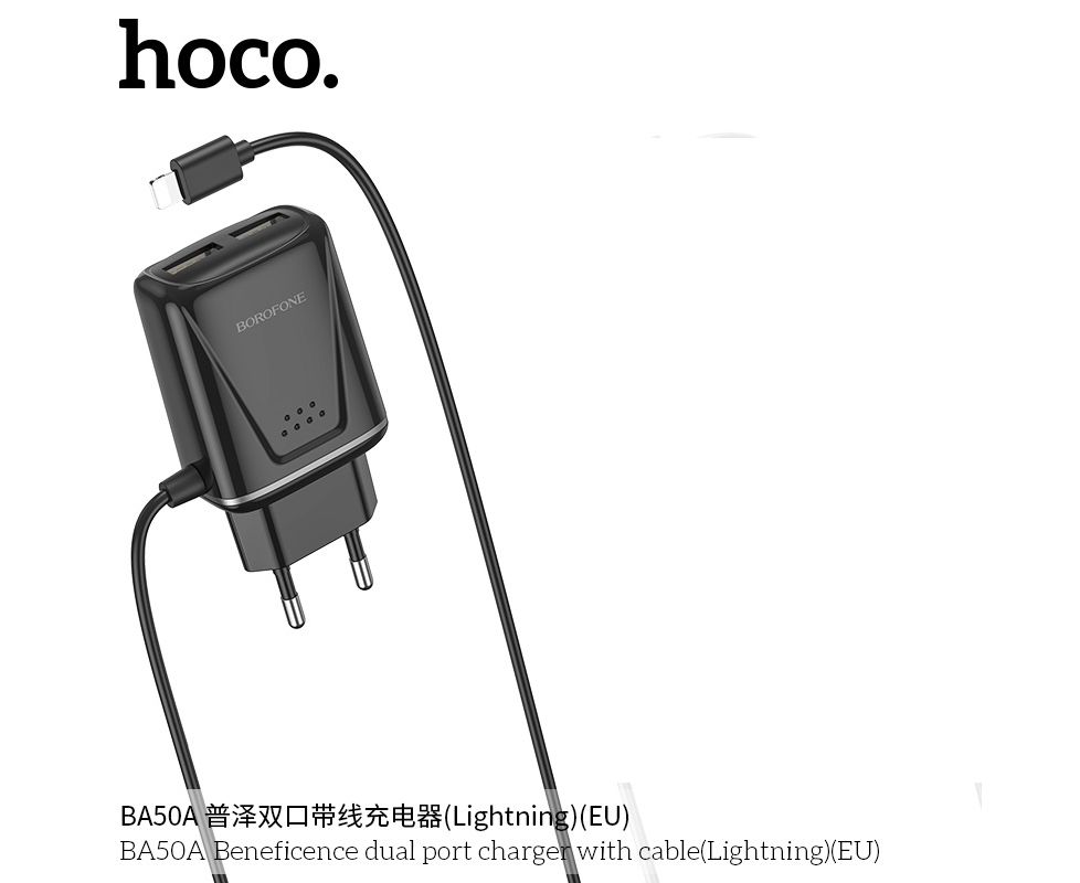 СЗУ 2USB 2.1A для Lightning 8-pin со встроенным кабелем Borofone BA50A 1м изготовлен из материала АВС-пластика, что не позволяет нагреваться. Имеет 2 выхода USB со встроенным кабелем для Lightning, microUSB, USB-C.