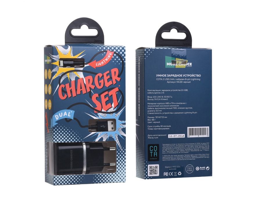 Материал: PC, ABS-пластик. Количество разъемов USB: 2 Вход: 100В/240В. Максимальный выходной ток: 2.4 A Дата-кабель в комплекте: Lightning 8-Pin (1 м) Комплектация: сетевое зарядное устройство, дата-кабель, держатель для кабеля, буклет Цвета: Black, White