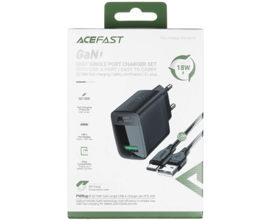 СЗУ ACEFAST A90 QC18W GaN single USB-A charger with charging cable USB-C-USB-A EU Black