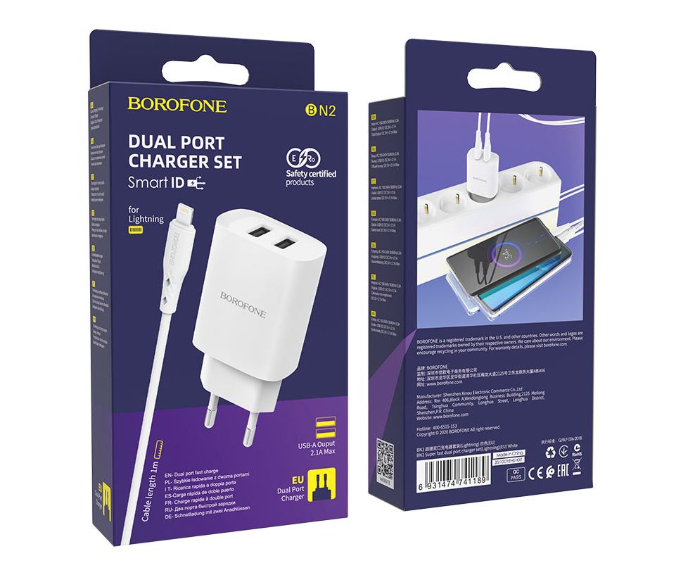 СЗУ BOROFONE BN2 Super fast 2USB, charger set + Lightning (белый)