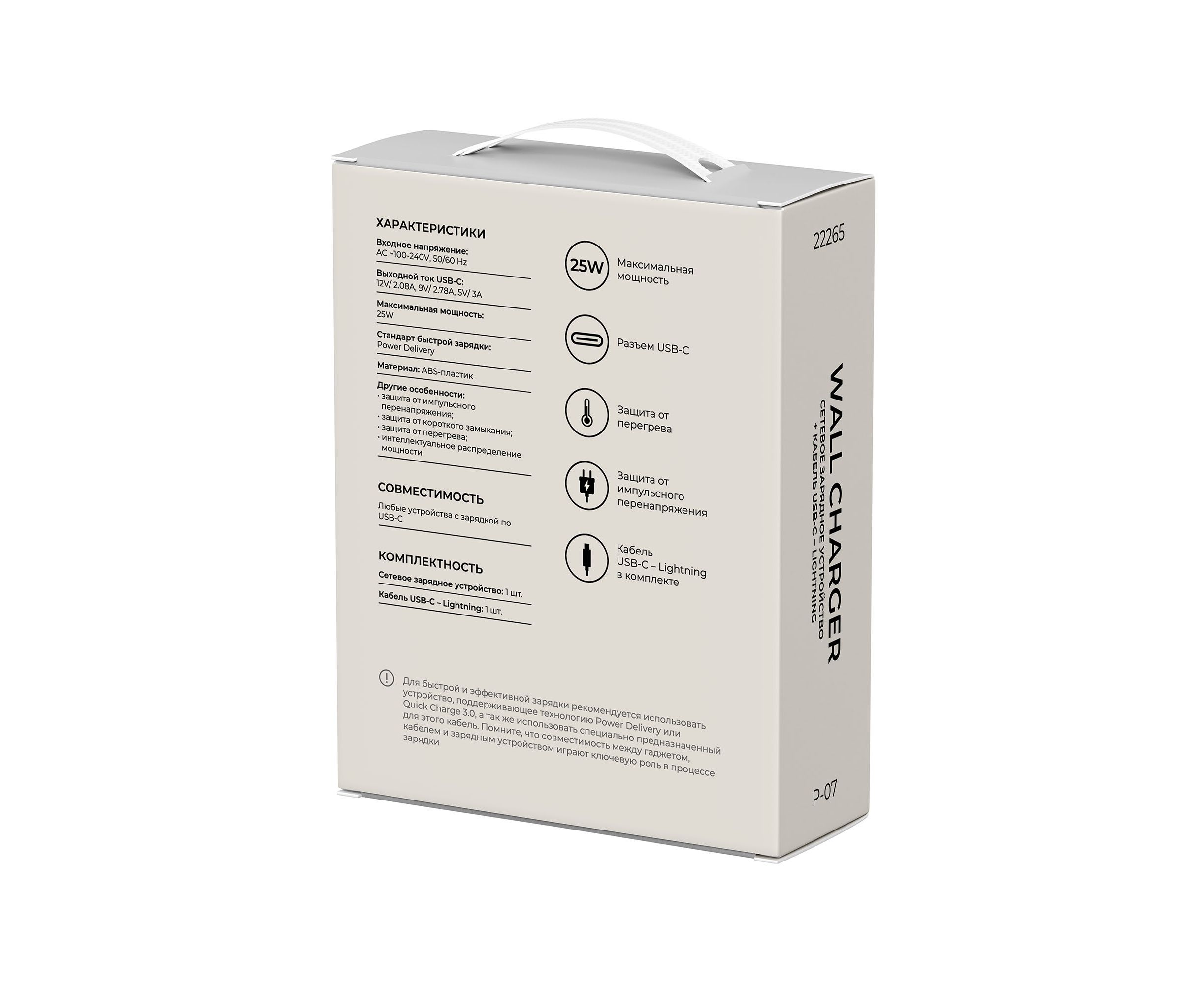 Сетевое зарядное устройство BREAKING P-07 выполнено из ударопрочного ABS-пластика. Модель рассчитана на входное напряжение 100-240V и обеспечивает выходную мощность до 25W и выходной ток до 3.0A. Блок с одним разъемом USB-C. Модель поддерживает технологию быстрой зарядки Power Delivery и позволяет зарядить смартфон до 75% всего за 30 мин! Также, зарядное устройство поддерживает функцию защиты от перегрузок, короткого замыкания, импульсивного перенапряжения.