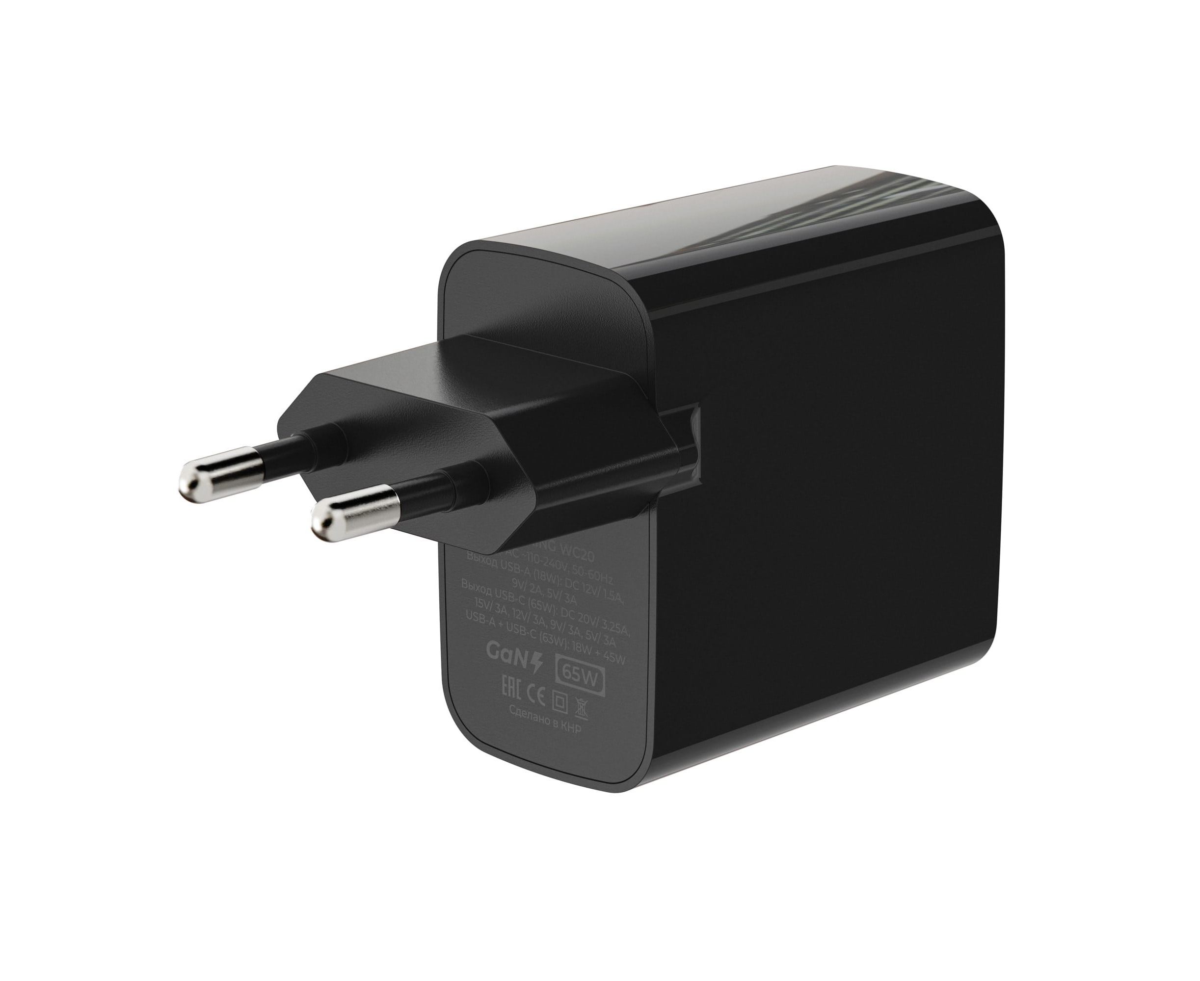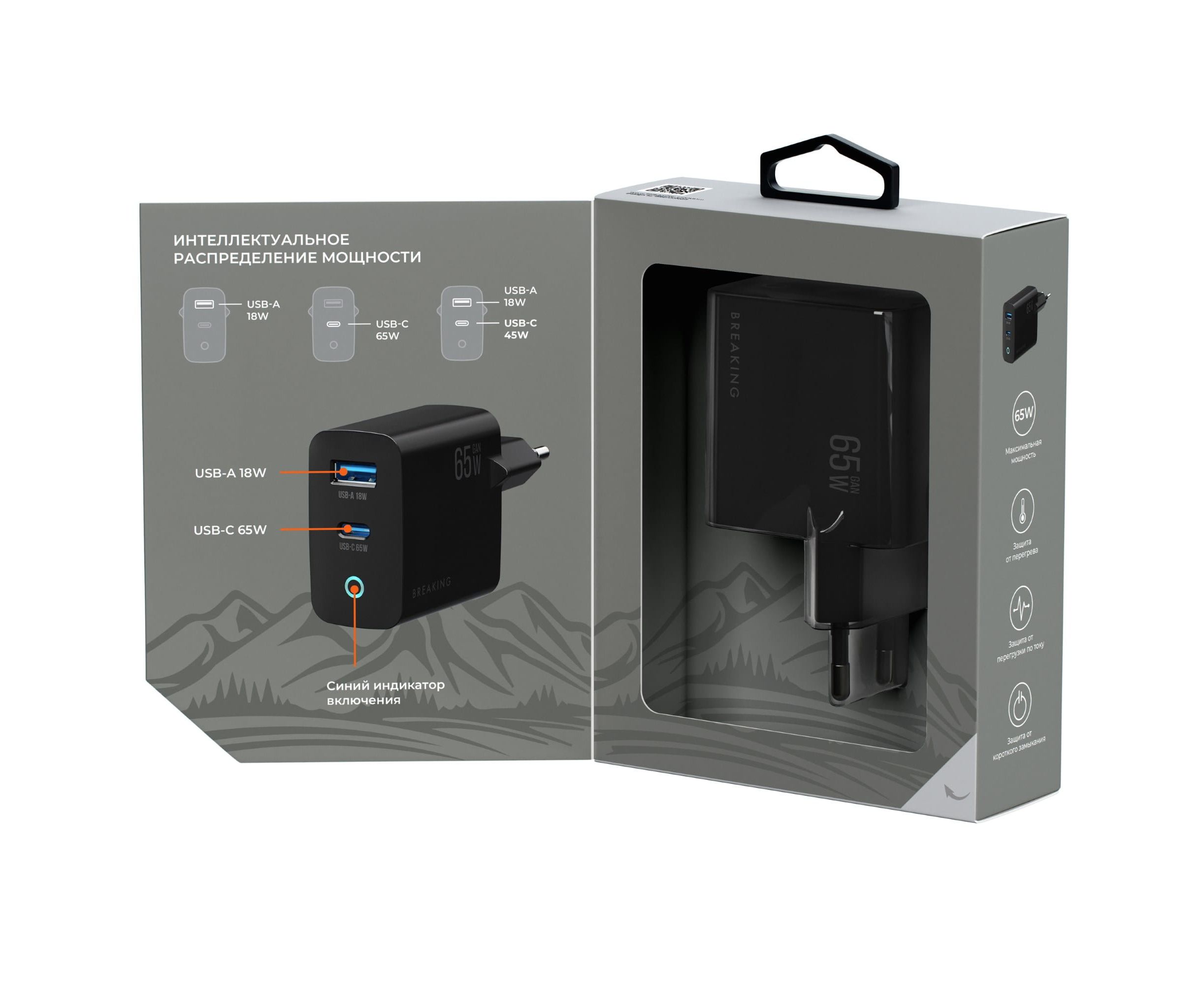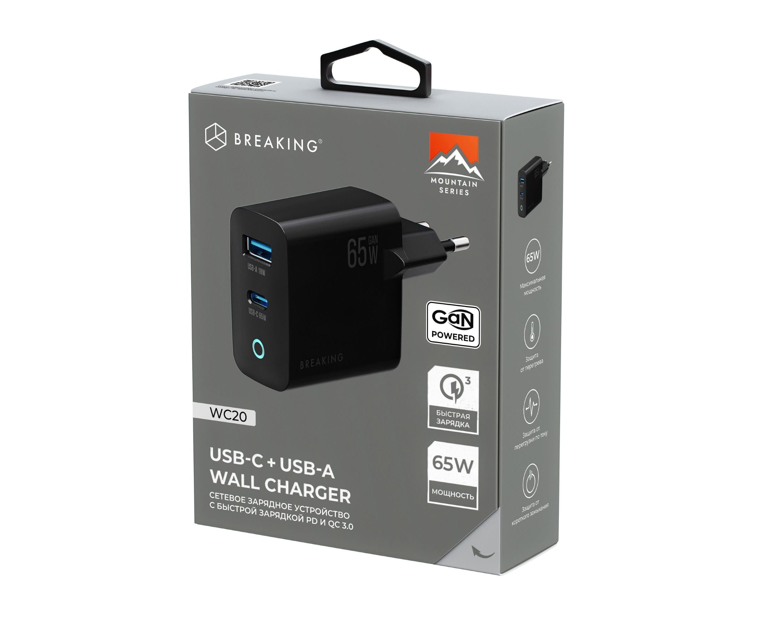 СЗУ Breaking WC20, USB-C + USB-А, GaN 65W, QC 3.0, 3A, MOUNTAIN SERIES (Черный)