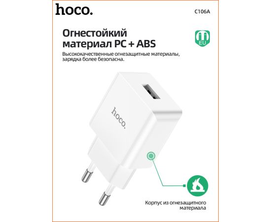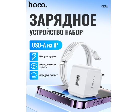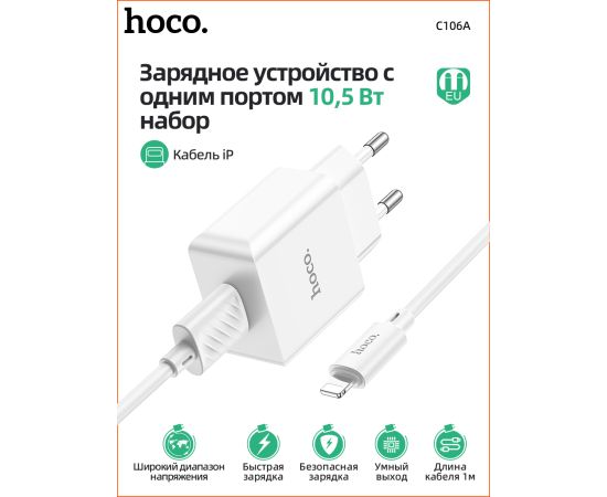 СЗУ HOCO C106A Leisure, 1USB + iP (EU) (белый)