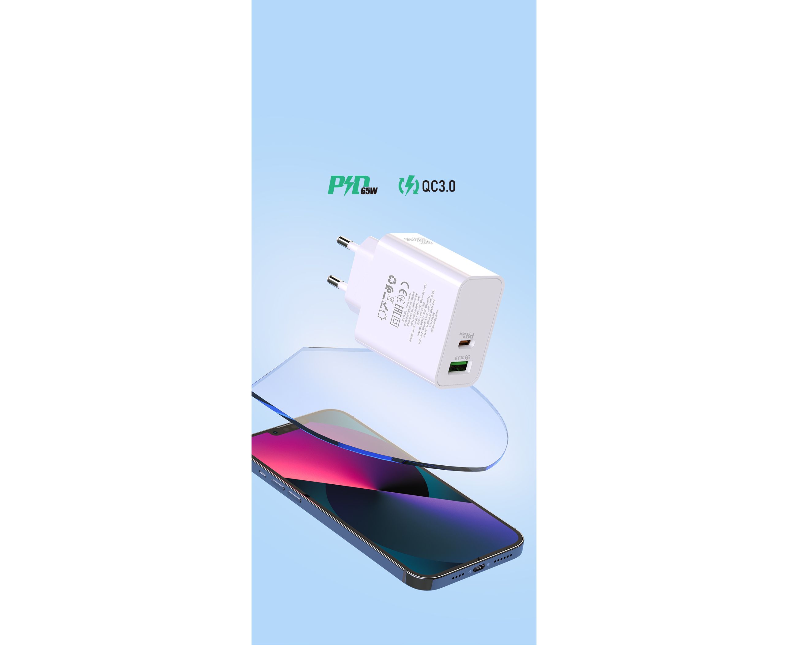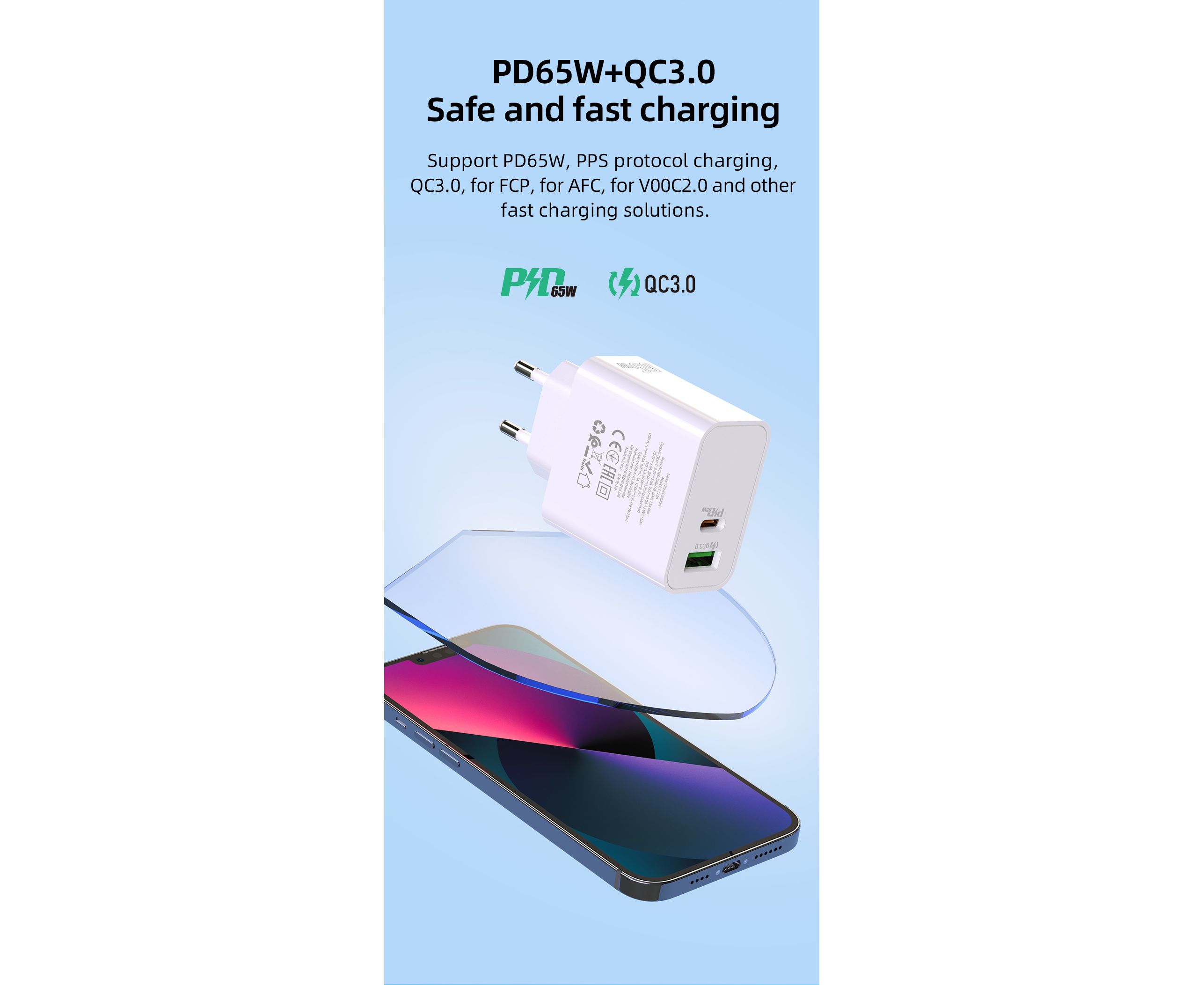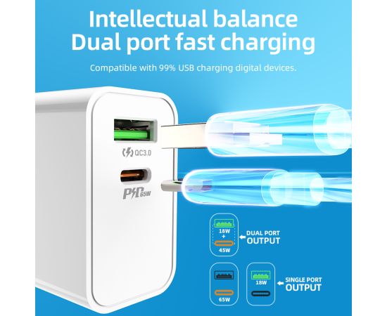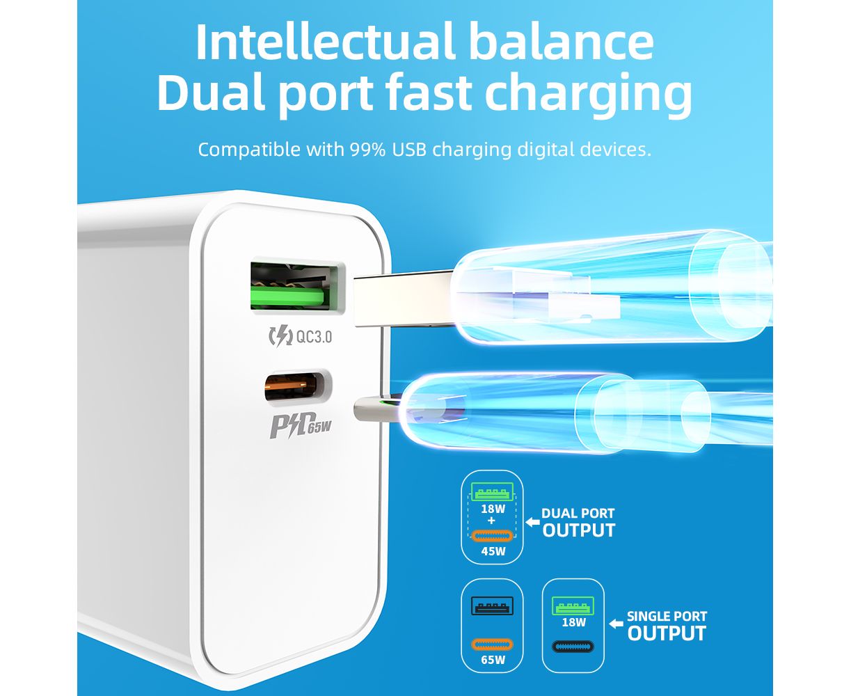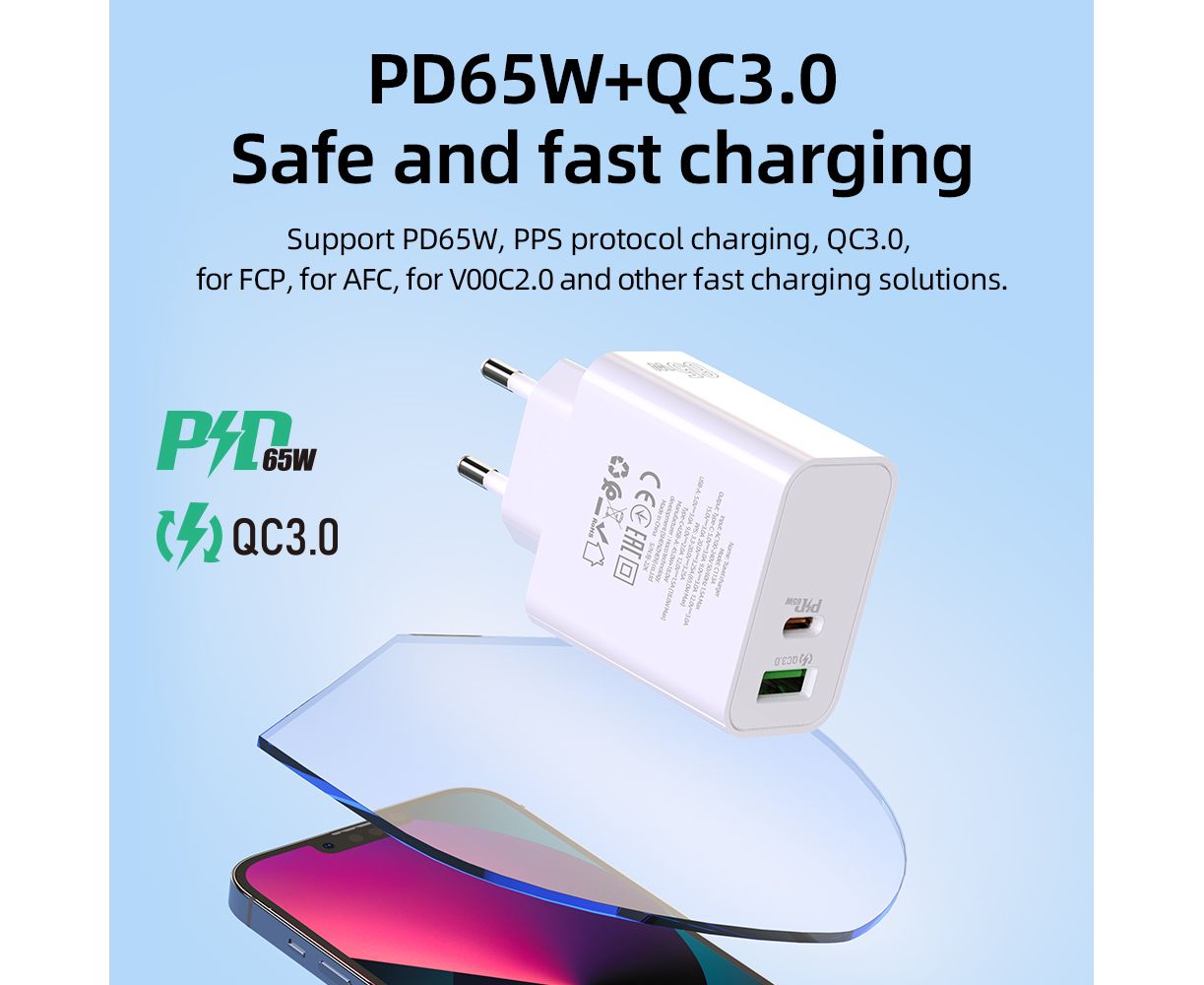 4) Поддержка максимальной выходной мощности одного порта 65 Вт, зарядка по протоколу PPS, QC3.0, AFC, FCP, VOOC 2.0 и другие решения для зарядки.