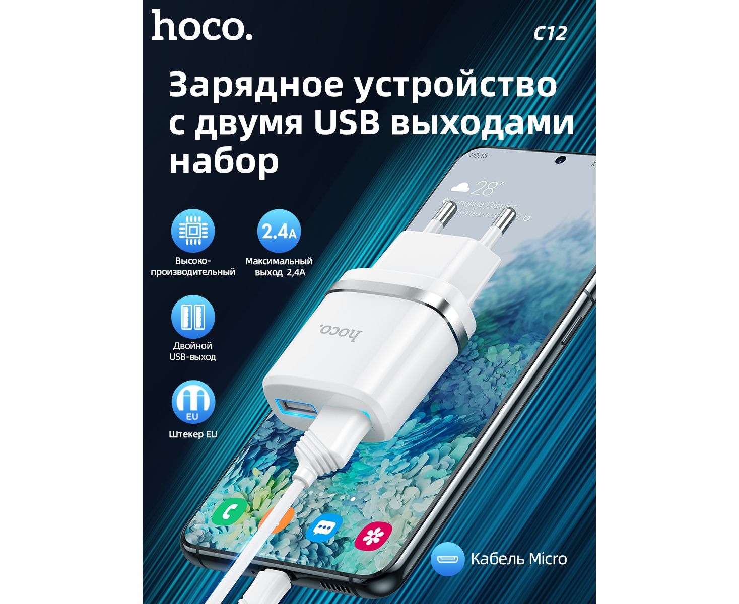 СЗУ HOCO C12, 2USB, 2.4A + Micro (белый)