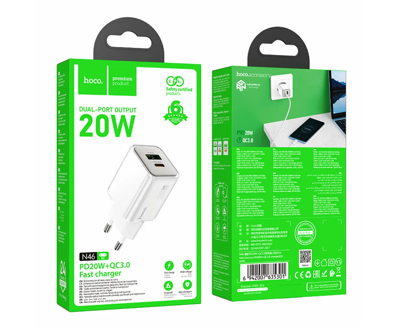 Сетевое зарядное устройство, 1 USB 3.0 QC+1 PD 20W (N46), HOCO, белый