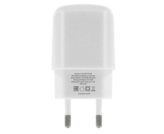 Сетевое зарядное устройство KF - зарядка через USB порт, выходная сила тока до 2.1Ампер. Материал корпуса- пластик. Входное напряжение (Input): 110 - 260 В, 50-60Гц. Выходное напряжение (Output): 4.5 - 5.5 В.