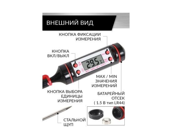 Цифровой термометр применяется для измерения температуры в салоне автомобиля, для проверки для качества работы системы кондиционирования воздуха, а также может применяет везде где требуется произвести замер температуры. В быту при тепловой обработке пищи. В производстве при поддержании необходимой температуры в производственных циклах. В сельском хозяйстве и пр. Прибор выполнен из качественного ABC пластика. Щуп изготовлен из нержавеющей стали.
