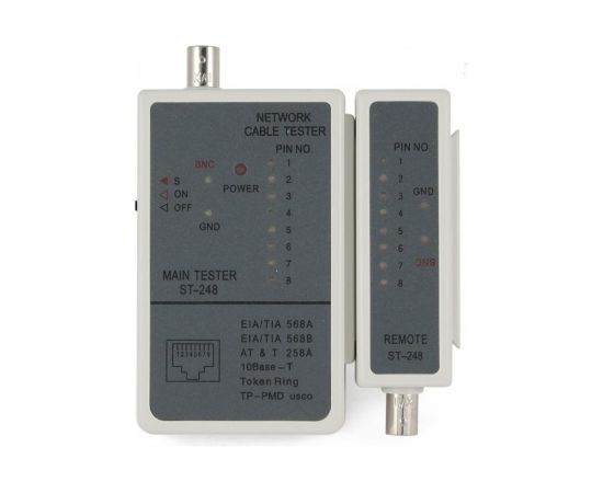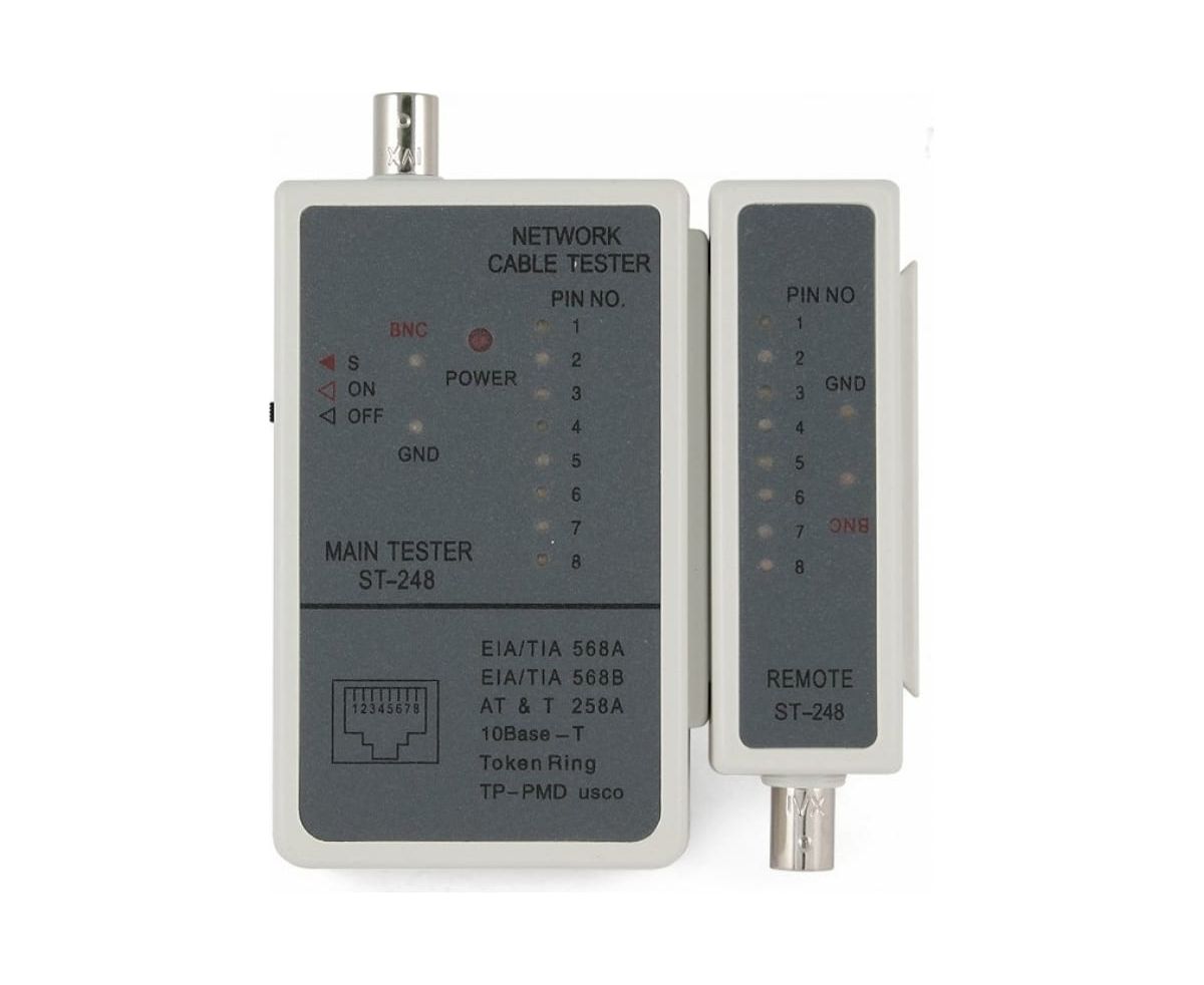 Тестер Cablexpert LAN для RJ-45, RG-58 NCT-1 помогает быстро определить неисправность в кабельной сети, протестировать кабель на обрыв, замыкание, проверить целостность экрана и правильность разводки кабеля.