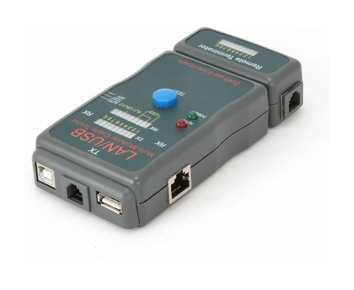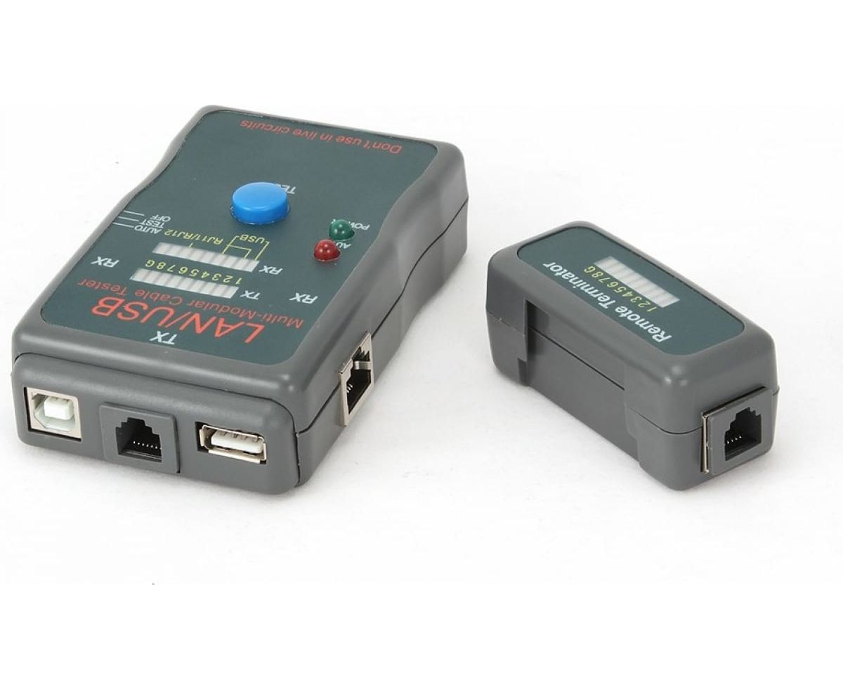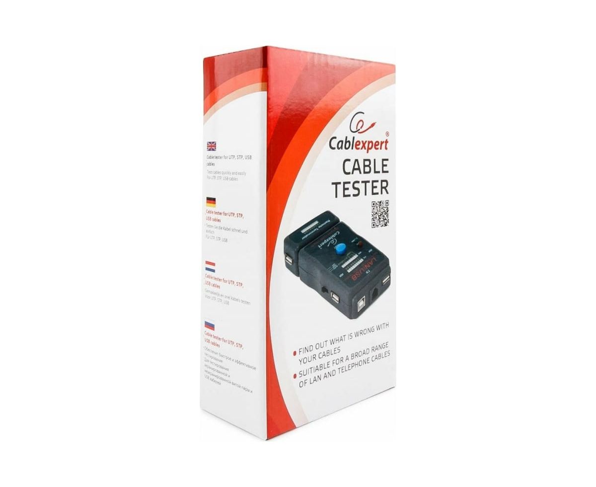 Тестер Cablexpert LAN 100/1000 Base-TX, для UTP, STP, RJ-11, USB-кабеля NCT-2 помогает быстро определить неисправность в кабельной сети, протестировать кабель на обрыв, замыкание, проверить целостность экрана и правильность разводки кабеля.
