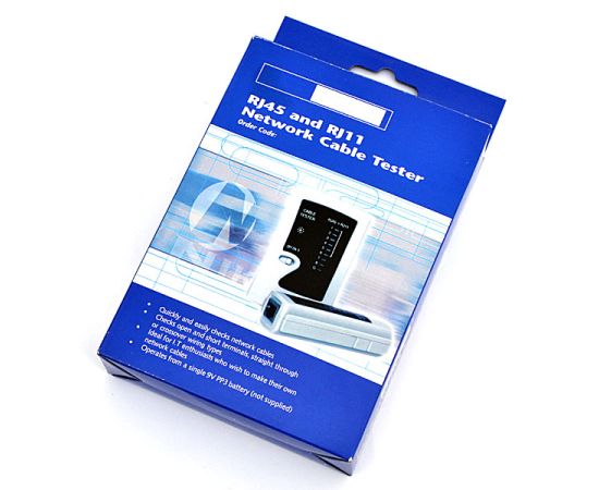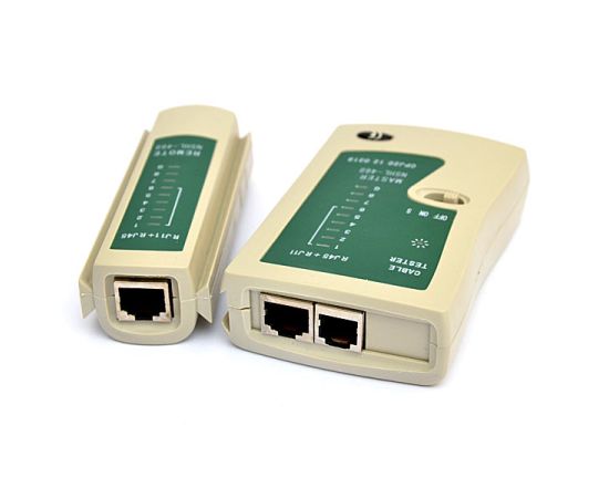 Сетевой тестер для проверки (тестирования) качества соединений (обжима) сетевых кабелей с выходами RJ45/RJ11 (витая пара и телефонная линия).