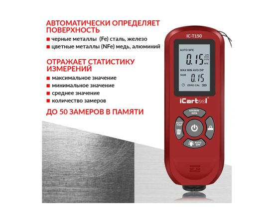 Толщиномер IC-T150 измеряет толщину лакокрасочного покрытия на любых металлах автоматически определяя их тип — черный или цветной. С помощью толщиномера вы сможете определить толщину: краски, эмали, грунтовки, лака, хрома или меди. Отличительная особенность прибора - информативный дисплей, отражающий одновременно 2 значения: текущее значение замера и статистику измерений. В комплекте идет набор для самостоятельной калибровки датчика и шнурок для переноски.