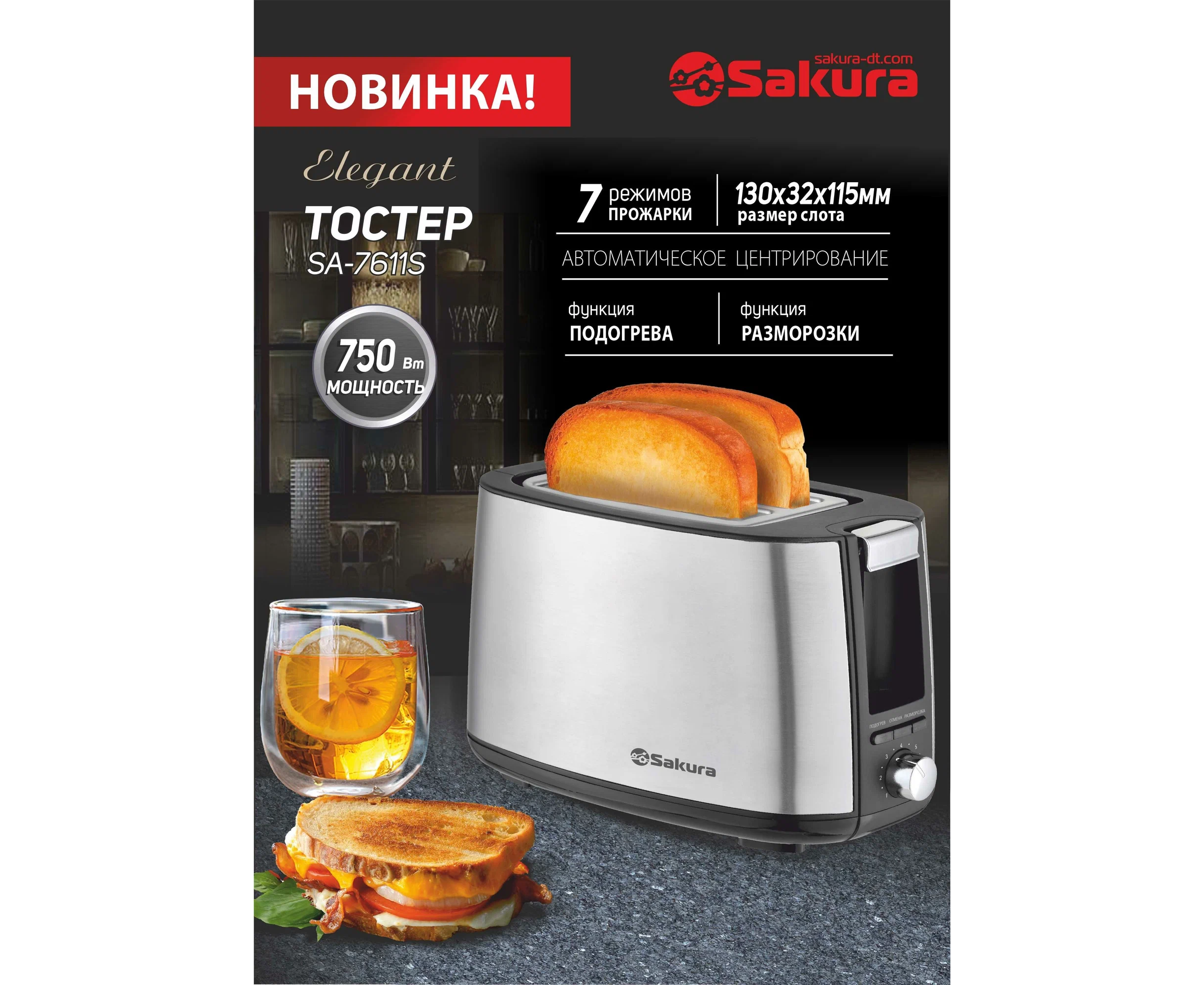 Тостер SAKURA SA-7611S Elegant 750Вт сталь