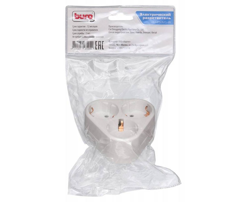 Тройник Buro BU-PS3VG-W (3 розетки) белый (пакет ПЭ)