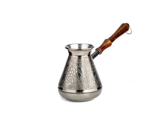 Как приятно выпить чашку свежего только что сваренного кофе. Подлинная находка для любителей настоящего ароматного напитка – турка LARA. Турка латунного цвета выполнена из высококачественной меди в аутентичном дизайне с изящным узором «Виноград». Произведено в России. Удобная лакированная ручка из натурального дерева не будет нагреваться при использовании, а металлическое кольцо позволит подвешивать турку и удобного хранить её. Узкое горлышко способствует наилучшему раскрытию вкуса. Подходит для приготовления натурального кофе на газовых и электрических плитах. Турка дополнит кухонный интерьер и подарит новый опыт в приготовлении кофе.