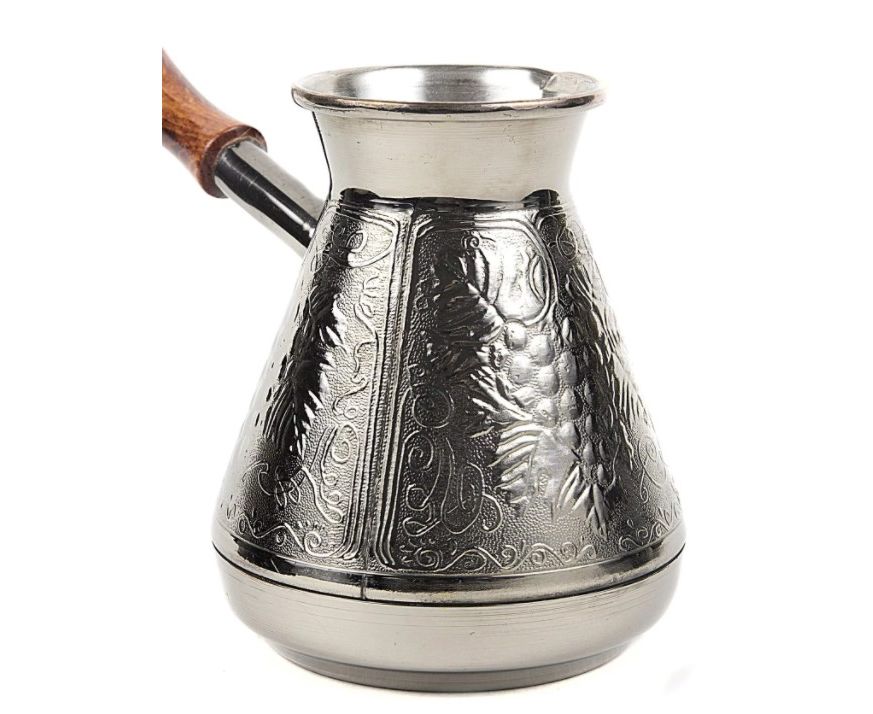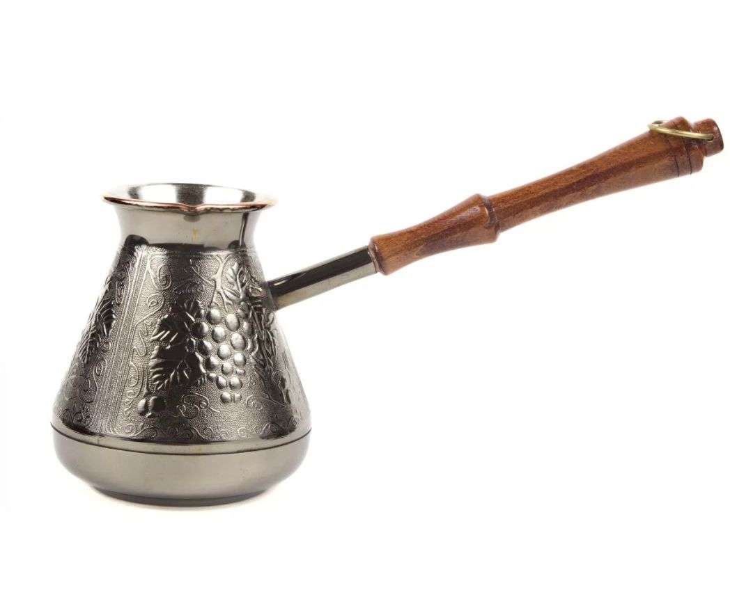 Медная турка классической конусообразной формы с утолщённым дном предназначена для приготовления ароматного натурального кофе. Внутренняя поверхность покрыта пищевым оловом. Наружная сторона украшена оригинальным орнаментом.