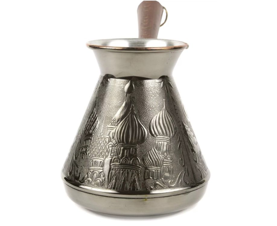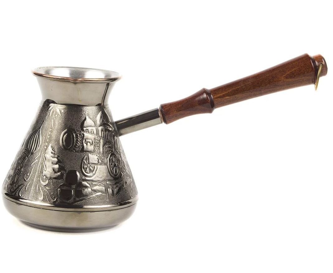 Медная турка классической конусообразной формы с утолщённым дном предназначена для приготовления ароматного натурального кофе. Внутренняя поверхность покрыта пищевым оловом. Наружная сторона украшена оригинальным орнаментом.
