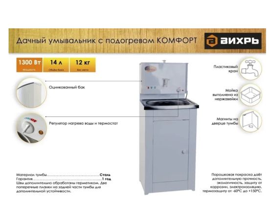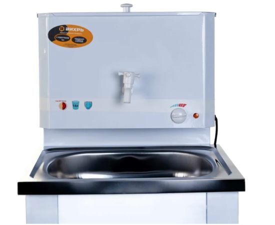 Умывальник серии "Комфорт" - новинка 2019 года от российского производителя ВИХРЬ. Аппарат белого цвета, с металлической тумбой и нержавеющей мойкой. Есть подогрев.