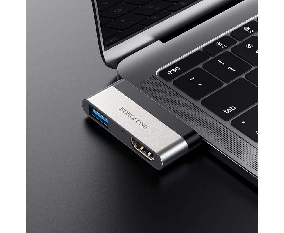 USB-концентратор Borofone DH2, алюминий, Type-C на HDMI, USB 3.0, цвет: серый(1/18/180)