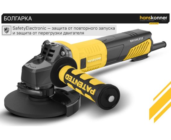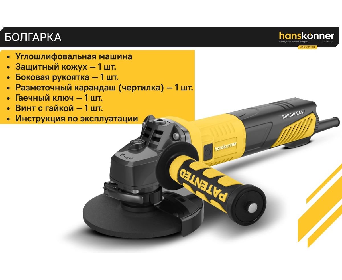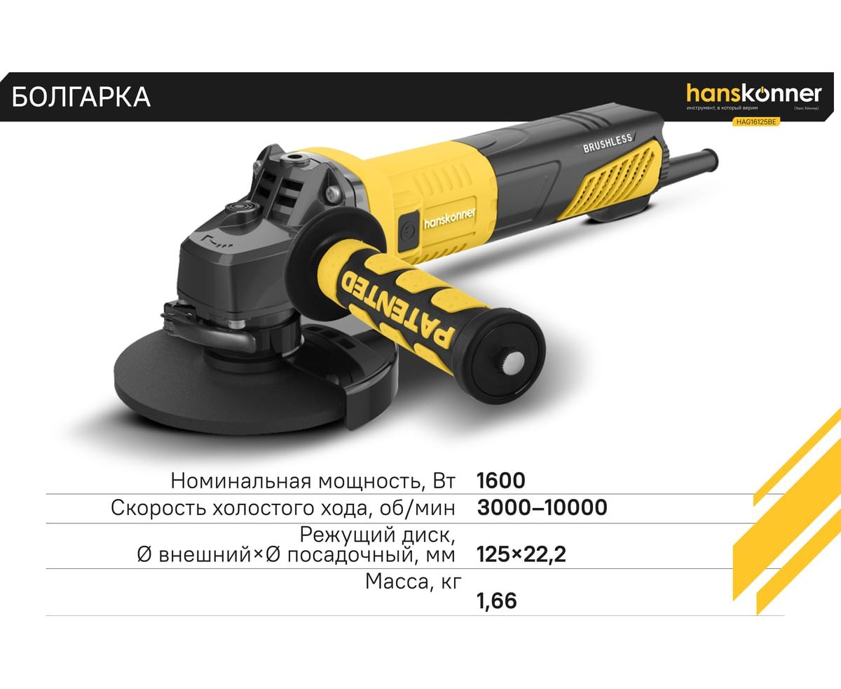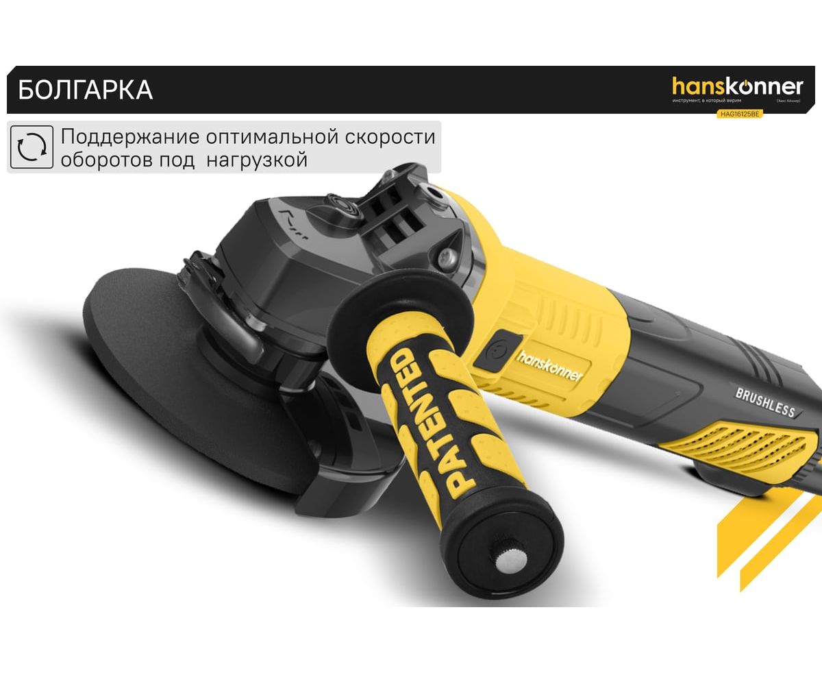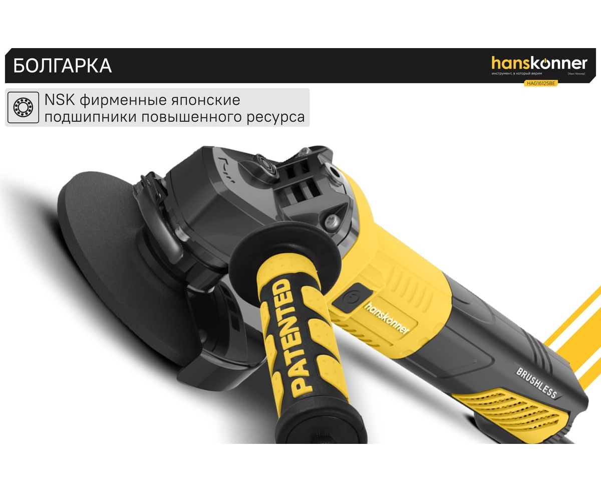 Угловая шлифовальная машина Hanskonner HAG16125BE — мощный и компактный электроинструмент для шлифования и зачистки поверхностей, а также резки металлов, кирпича, керамики или камня без использования воды. Данная модель имеет бесщеточный электродвигатель мощностью 1600 Вт и фирменные японские подшипники NSK, что повышает продуктивность и рабочий ресурс. Также, ресурс инструмента, подкреплен герметичным выключателем, функцией плавного пуска и защитой от перегрузки двигателя.