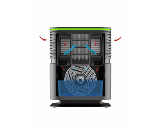Комнатный воздух затягивается внутрь AW735 через боковые решетчатые стенки. Сначала он проходит через два фильтра HEPA13+антиформальдегид и очищается от вирусов, бактерий, пыли, аллергенов, неприятных запахов и формальдегида. Затем поступает на пластинчатый барабан, который медленно вращается в поддоне с водой, где насыщается влагой. После этого очищенный и увлажненный воздух поступает обратно в помещение через переднюю решетчатую стенку. Эффективность очистки: CADR 320 м³/ч - 99,97%.