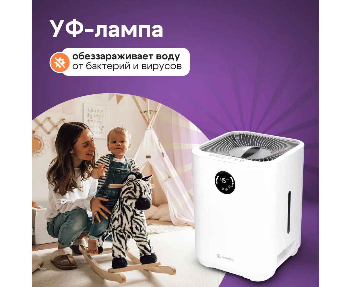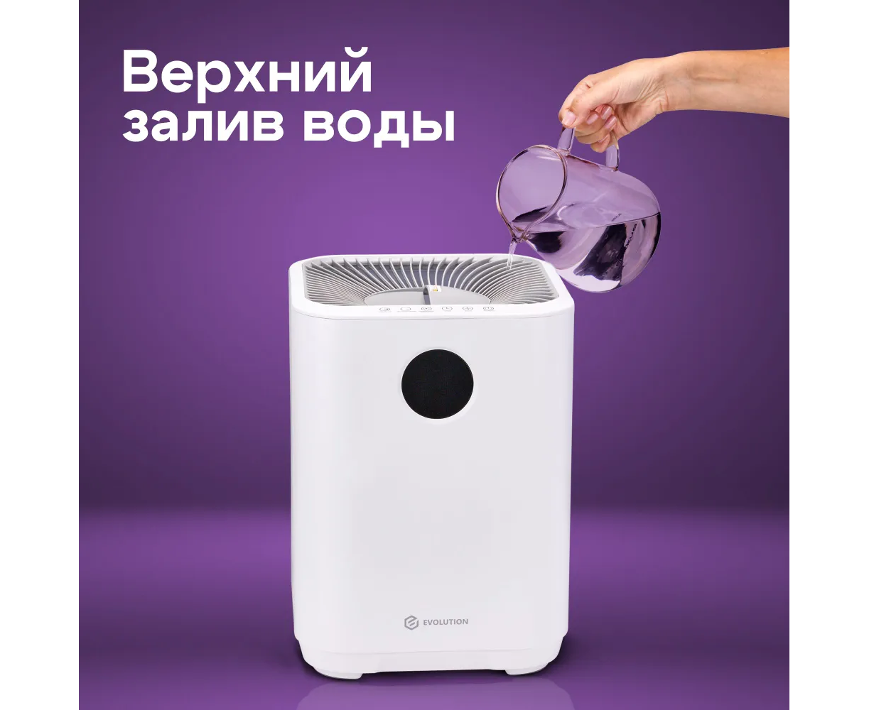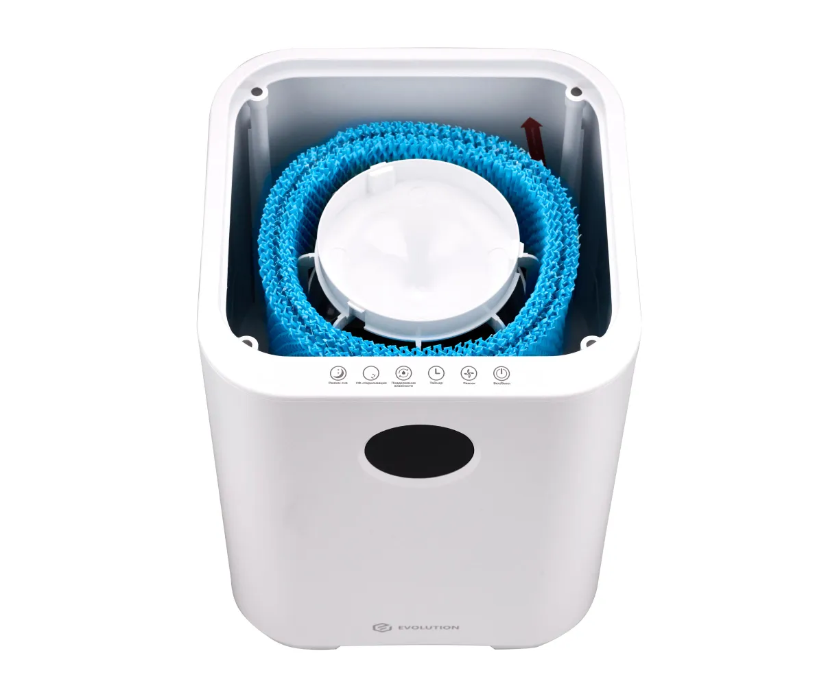 Увлажнитель воздуха для дома EVOLUTION SmartAir Evaporative Pure HF-577 Smart основан на принципе естественного испарения. Его конструкция оснащена встроенным вентилятором, который при работе устройства забирает сухой воздух и пропускает его через влажный фильтр, что ускоряет процесс насыщения воздуха влагой и способствует повышению уровня влажности в помещении. Фильтр задерживает мелкую пыль, известь и другие вещества из воздуха и воды, тем самым очищая их и распыляя увлажненный воздух. Ультрафиолетовая лампа стерилизуют воду, уничтожая бактерии и вирусы. Благодаря этому вода не «цветет» и не источает неприятный запах. Функция ионизации создает отрицательные ионы, которые заставляют плавающие в воздухе частицы (пыль, шерсть домашних животных, аллергены) слипаться и падать на пол.