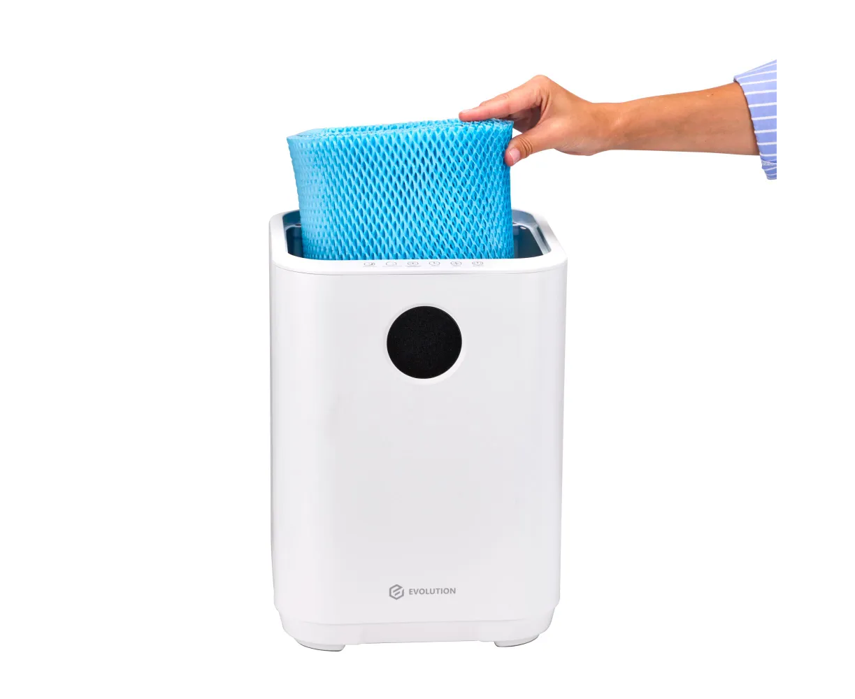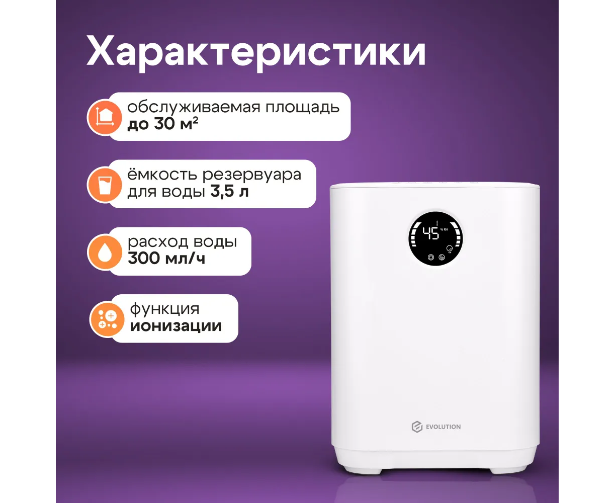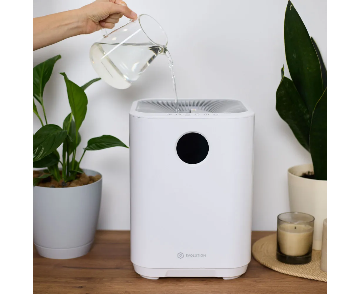 Увлажнитель воздуха для дома EVOLUTION SmartAir Evaporative Pure HF-577 Smart основан на принципе естественного испарения. Его конструкция оснащена встроенным вентилятором, который при работе устройства забирает сухой воздух и пропускает его через влажный фильтр, что ускоряет процесс насыщения воздуха влагой и способствует повышению уровня влажности в помещении. Фильтр задерживает мелкую пыль, известь и другие вещества из воздуха и воды, тем самым очищая их и распыляя увлажненный воздух. Ультрафиолетовая лампа стерилизуют воду, уничтожая бактерии и вирусы. Благодаря этому вода не «цветет» и не источает неприятный запах. Функция ионизации создает отрицательные ионы, которые заставляют плавающие в воздухе частицы (пыль, шерсть домашних животных, аллергены) слипаться и падать на пол.