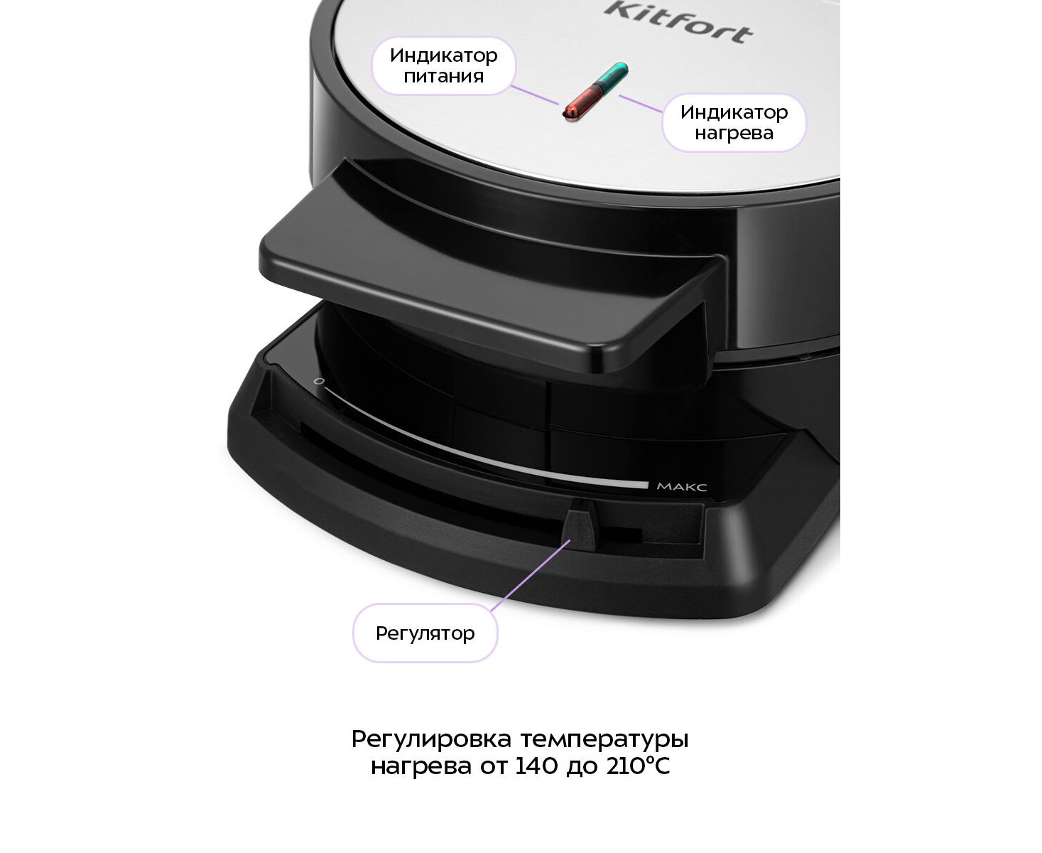 Вафельница оснащена регулятором нагрева, с помощью которого вы можете плавно настроить температуру приготовления вафель от 140±10°С до 210±10°С. Индикатор работы горит, когда прибор включен в сеть, а индикатор нагрева покажет, когда панели разогреются.