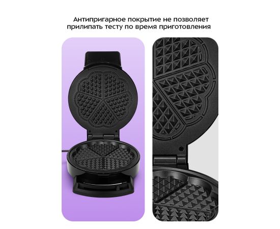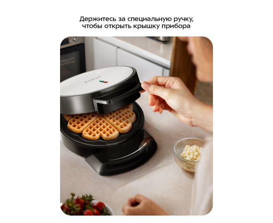 С электрической вафельницей КТ-5616 вы получите 1 готовую вафлю в форме цветка за одно приготовление. Готовую вафлю легко разделить на 5 аккуратных сердечек — красиво, вкусно и удобно. После приготовления добавьте ягоды и фрукты, и домашний десерт готов!