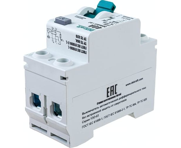Выключатель дифференциального тока DEKraft 2P 40А 30мА тип AC 6кА УЗО-03 14209DEK не обеспечивает защиту от перегрузки и токов короткого замыкания, он используется исключительно в сочетании с автоматическим выключателем, либо предохранителем.