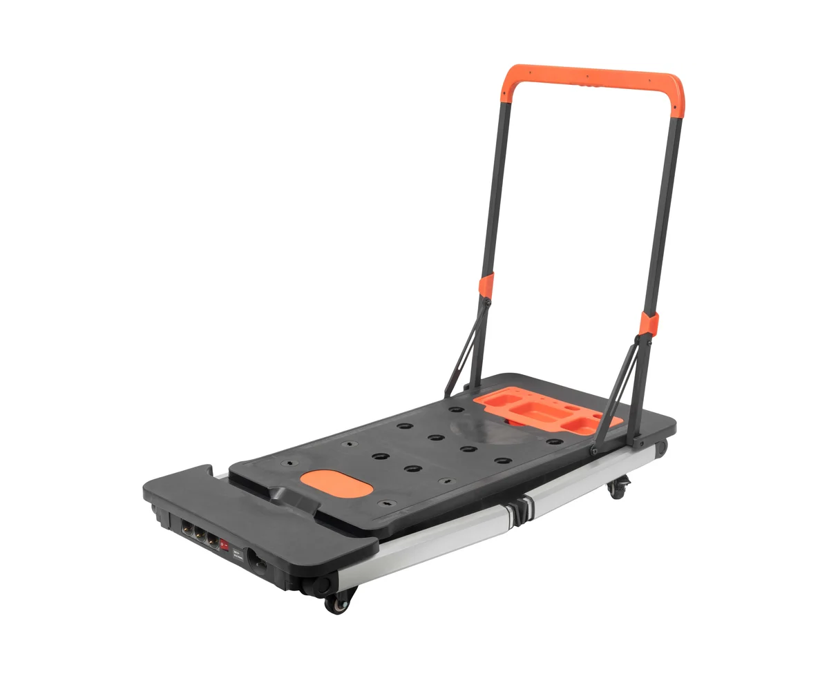Тележка с прорезиненными колесами и стопором добавляет устойчивости и маневренности.