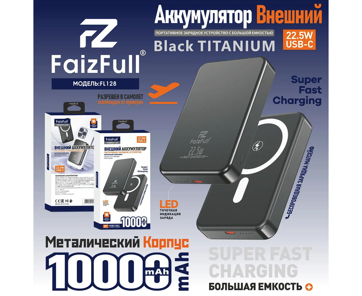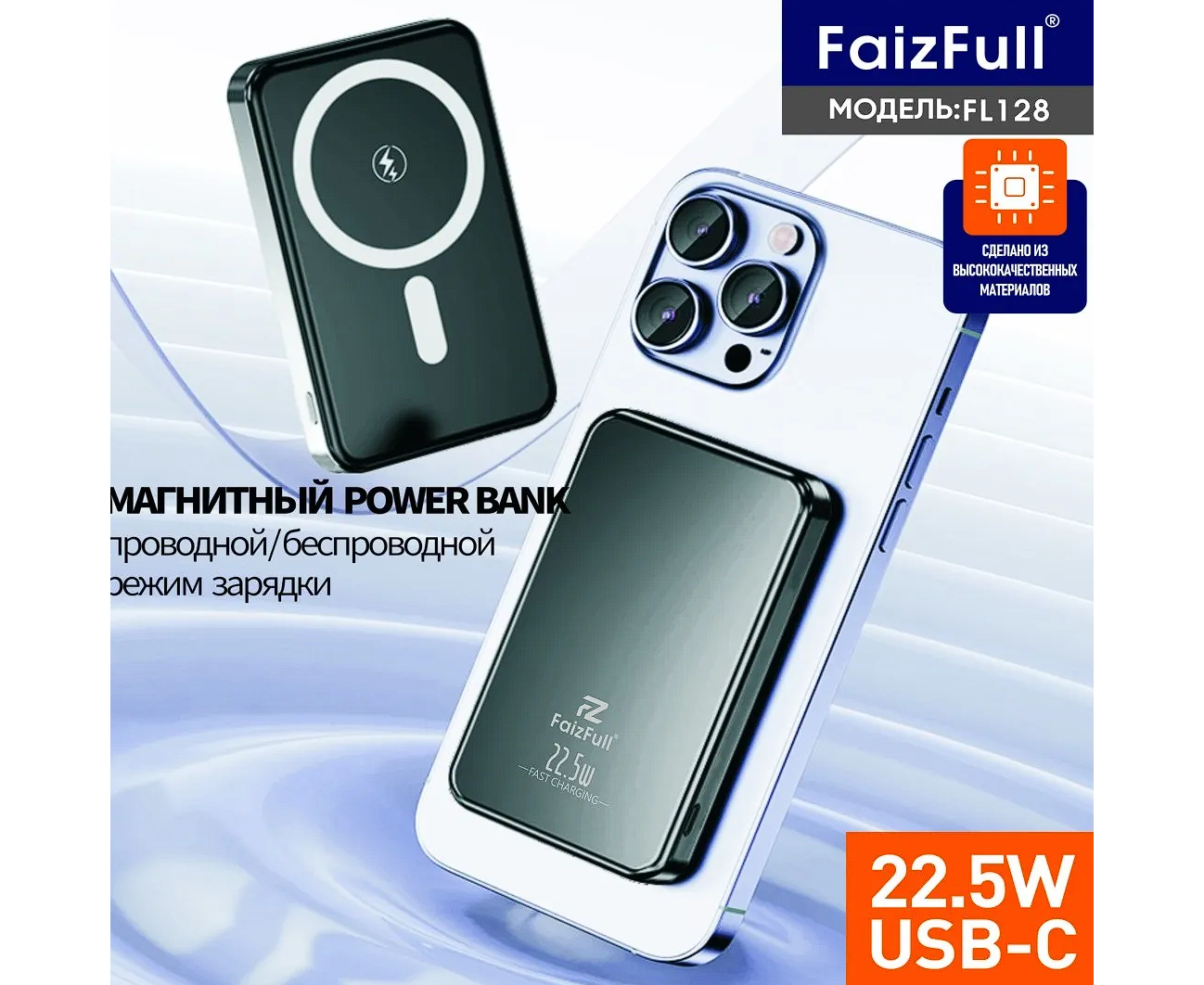 Внешний аккумулятор FaizFull FL128, 10 000 мА·ч, MagSafe, PD 22,5 Вт, чёрный.