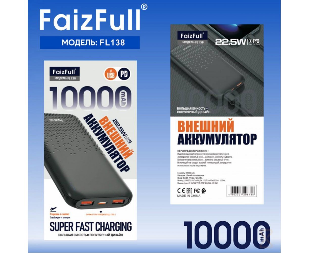 Внешний аккумулятор FaizFull FL138, 10 000 мА·ч, PD 22,5 Вт, черный. Надёжный и компактный внешний аккумулятор для быстрой подзарядки смартфонов, планшетов и других гаджетов — ваш незаменимый помощник в поездках, на работе и в повседневной жизни.