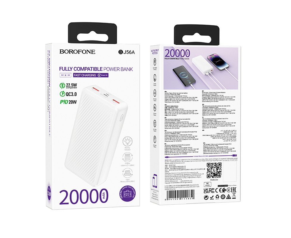 Borofone BJ56A - это стильный и функциональный внешний аккумулятор, который станет незаменимым помощником для тех, кто проводит много времени в дороге или путешествиях. Благодаря наличию трех выходных разъемов: 2 USB + Type-C вы сможете одновременно заряжать несколько устройств. Аккумулятор имеет емкость 20000mAh и поддерживает все современные протоколы быстрой зарядки, обеспечивая максимальную выходную мощность в 22.5W, что позволяет быстро зарядить смартфон, планшет, наушники и другие устройства. Портативный аккумулятор оснащен высококачественной литий-полимерной батареей, а корпус выполнен из огнестойкого ABS-пластика + PC. Светодиодный индикатор позволит отслеживать актуальный уровень заряда аккумулятора. Вес 408 г. Выполнен в двух цветах
