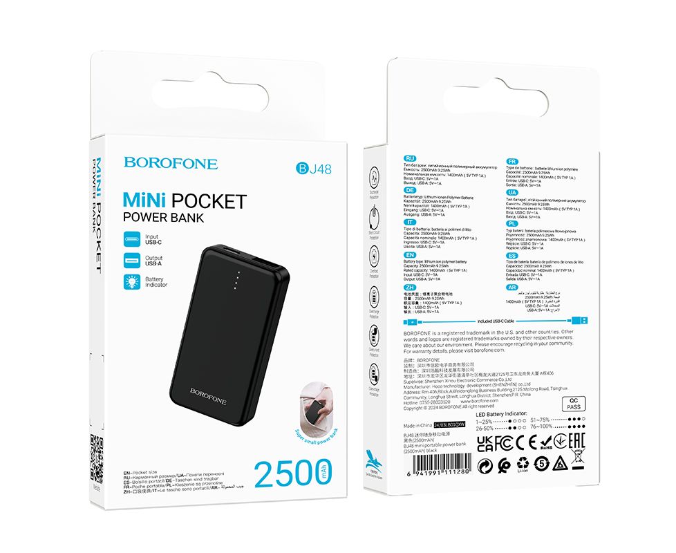 Внешний аккумулятор 2500mAh 1USB+Type-C 1.0A Borofone c LED дисплеем BJ48 mini (Black)