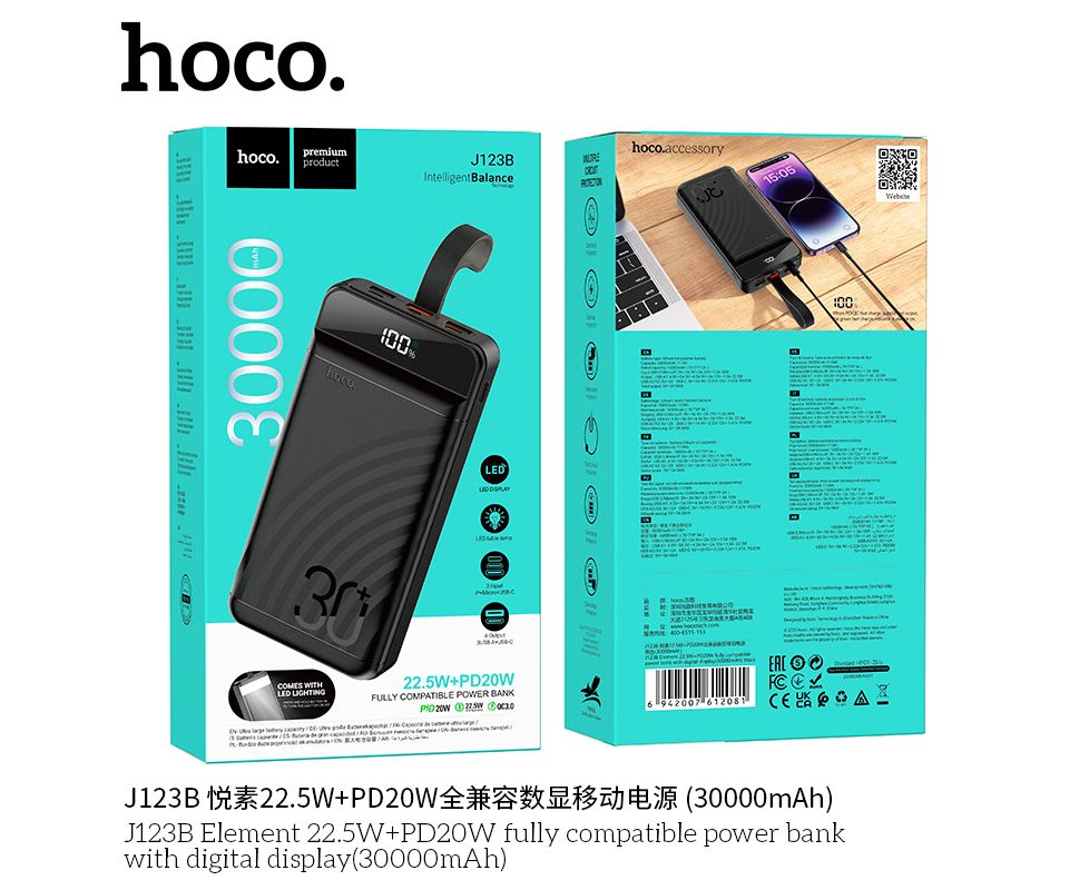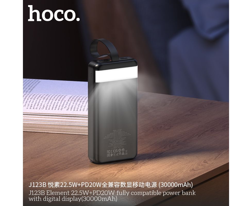 Внешний аккумулятор 30000mAh 22.5W+PD20W 3USB 3.0A с LED-дисплеем Hoco Element J123B (Black)