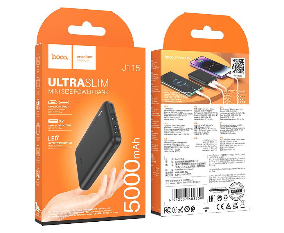 Компактный внешний аккумулятор Hoco J115 - это портативное устройство, которое позволяет заряжать мобильные устройства, когда нет доступа к электросети. Он оснащен встроенным литий-полимерным аккумулятором емкостью 5000 мАч и двумя портами USB, которые позволяют одновременно заряжать два устройства. Благодаря компактным размерам и небольшому весу, он поместится в любую сумку или рюкзак и не займет много места. Оснащен индикаторами уровня заряда, которые показывают, сколько энергии осталось в аккумуляторе. Hoco J115 - это надёжное и простое в использовании портативное устройство, которое поможет осуществить подзарядку вашего устройства где бы вы ни находились. Выполнен в двух цветах.