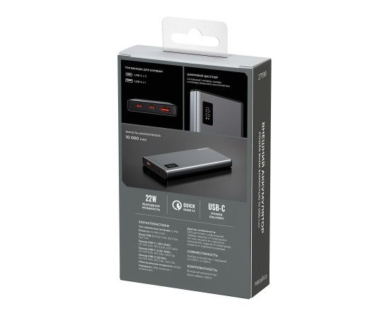 Внешний аккумулятор BREAKING Metallica выполнен из алюминиевого сплава и прочного ABS-пластика. Его емкость составляет 10 000 mAh. Устройство поддерживает входной ток: USB-C DC 5V-12V/ 3.0A и обеспечивает выходной ток USB-A DC 5V-12V/ 3.0A до 22.5W, выход USB-C DC 5V-12V/3.0A. Наличие двух разъемов USB-C и одного разъема USB-A позволяет заряжать одновременно три устройства. Технология защиты от перегрузок, короткого замыкания и перегрева гарантирует безопасность использования. Поддержка быстрой зарядки Power Delivery обеспечивает высокую скорость зарядки. Встроенный LED-дисплей поможет всегда оставаться в курсе уровня заряда и разряда внешнего аккумулятора.