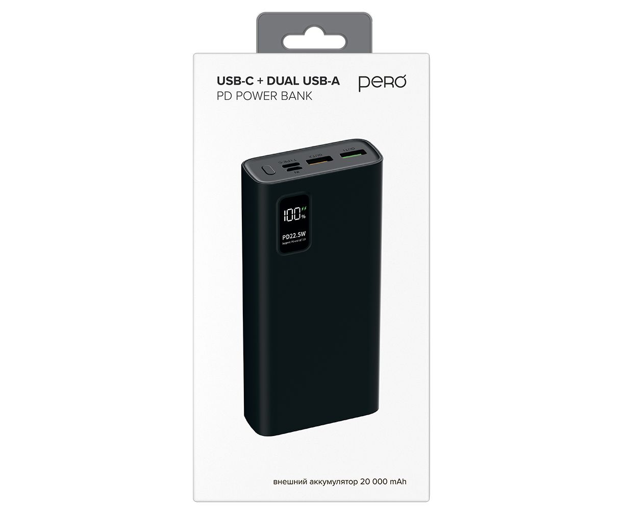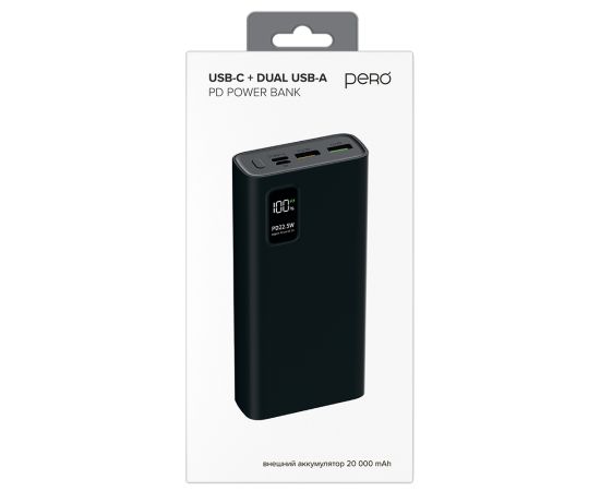 Внешний аккумулятор PERO PB06 20000 mAh, Li-Pol, output USB-C + 2 USB-A, черный