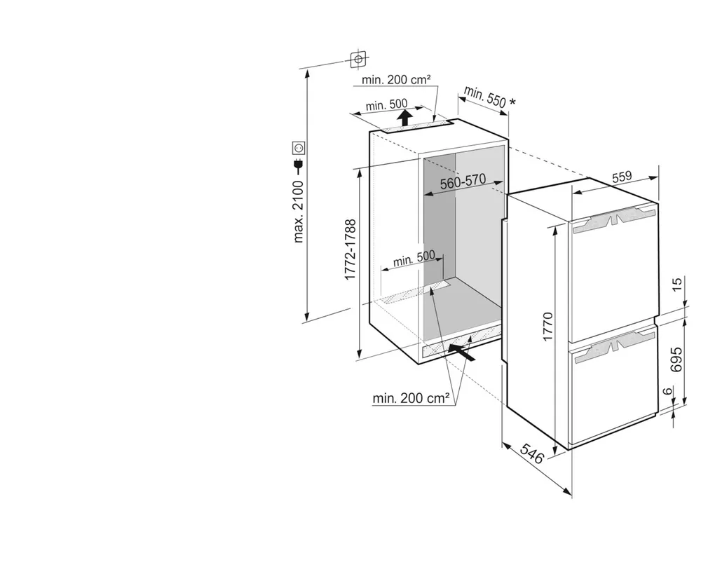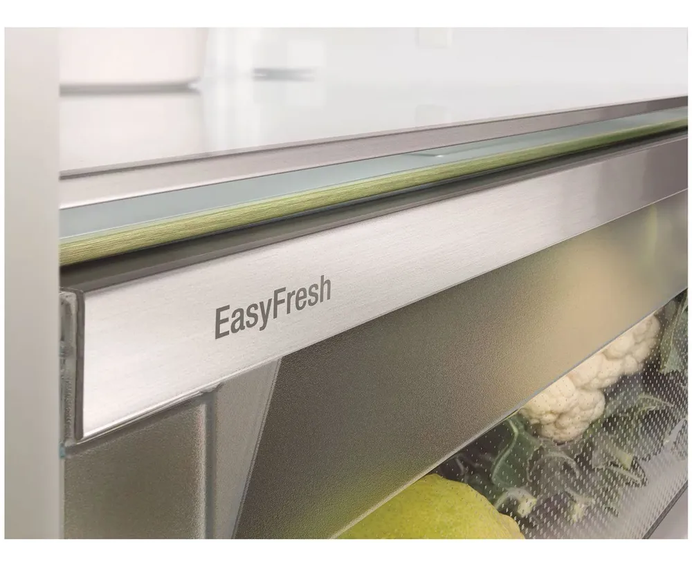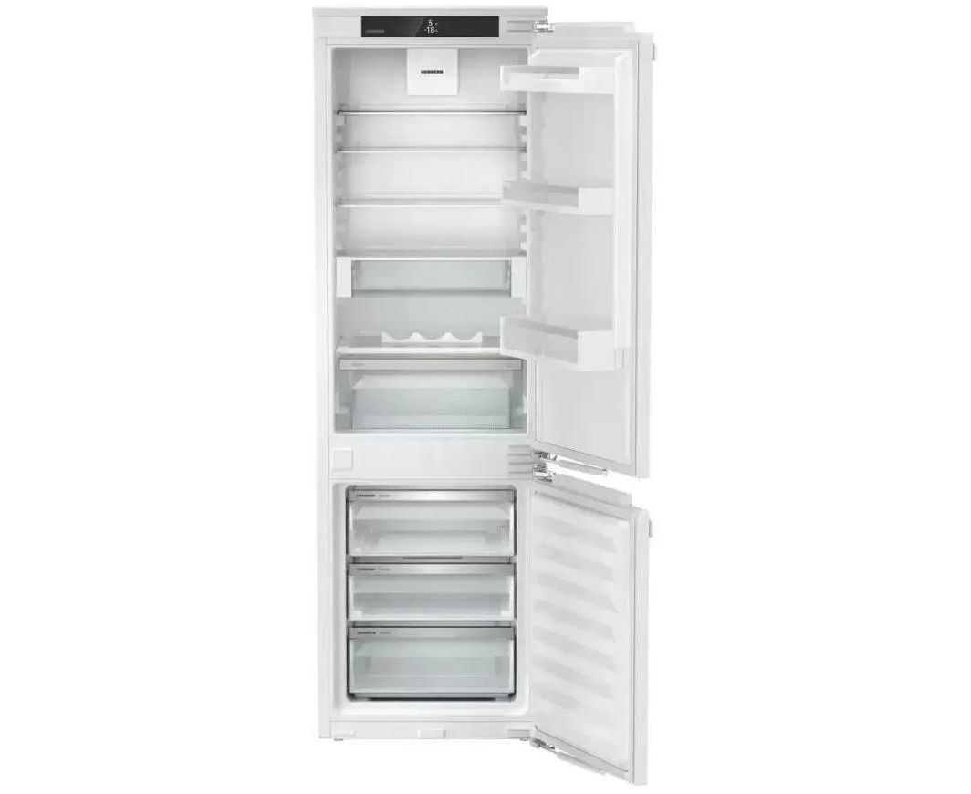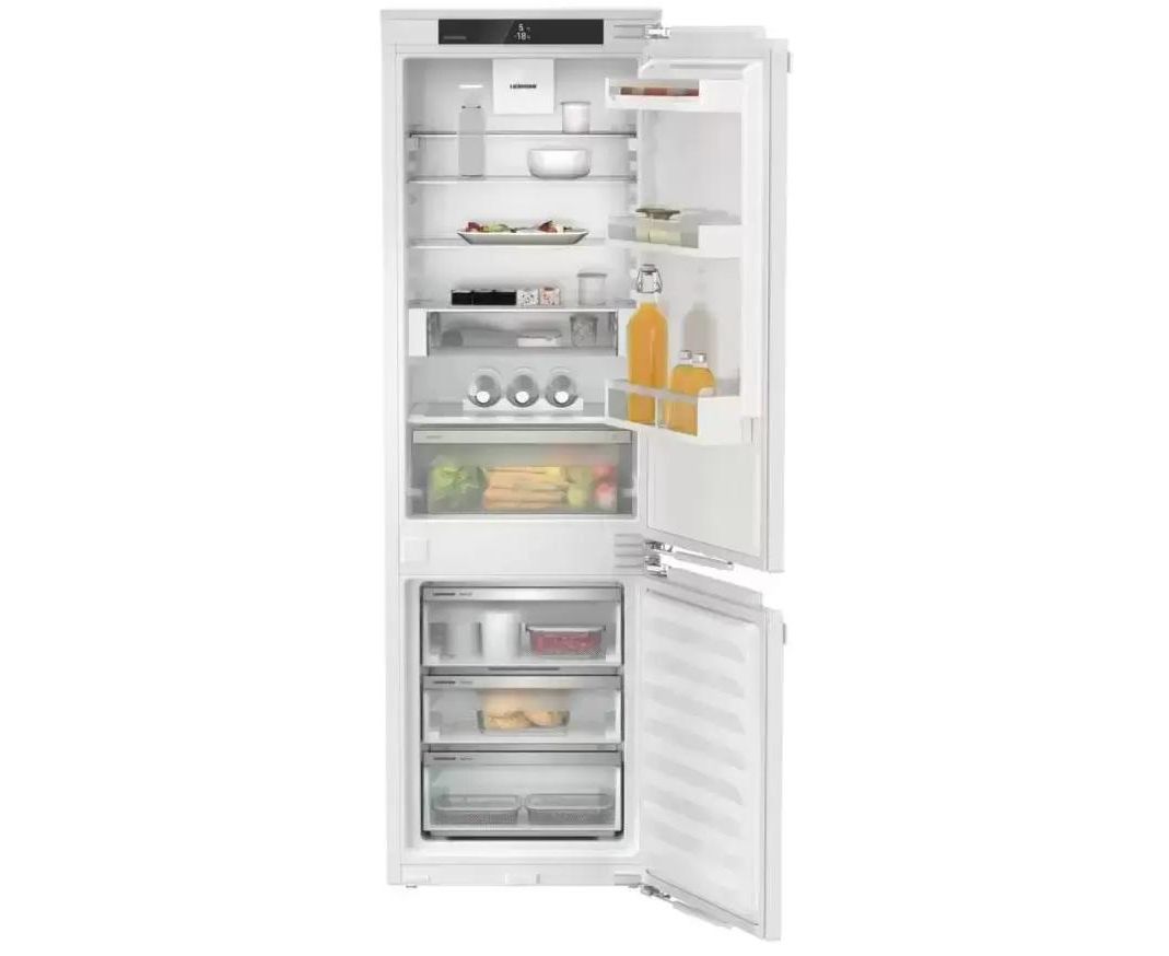 Встраиваемый холодильник Liebherr ICNd 5123 Plus высотой 177 см и полезным объемом 251 л. Внутри камера оснащена шестью полками, пять из которых регулируются по высоте, а одна разделяется. Контейнер EasyFresh обеспечивает более длительное хранение неупакованных овощей, фруктов и плодов, за счет плотно закрытой крышки и повышенной влажности. Сенсорное управление очень удобно и понятно, выбрать нужный режим можно в одно касание. Вы можете настроить ваше устройство и через приложение, после монтажа SmartDeviceBox, стандартные опции расширятся еще более удобными. IceCubeTimer во время вечеринки станет превращать воду в кубики льда с повышенной скоростью. HolidayMode сэкономит электроэнергию, но и не даст распространиться неприятным запахам. Режим BottleTimer активирует функцию SuperFrost и при достижении продуктом нужной температуры на приложение приходит уведомление.