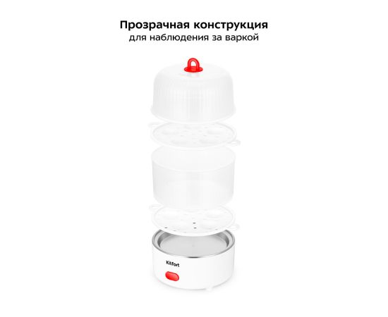 Корпус яйцеварки выполнен из пластика, а прозрачная крышка и паровой отсек позволяют наблюдать за процессом приготовления. В яйцеварке яйца готовятся на пару, что позволяет готовить их более равномерно. Вкус яиц получается более нежный.