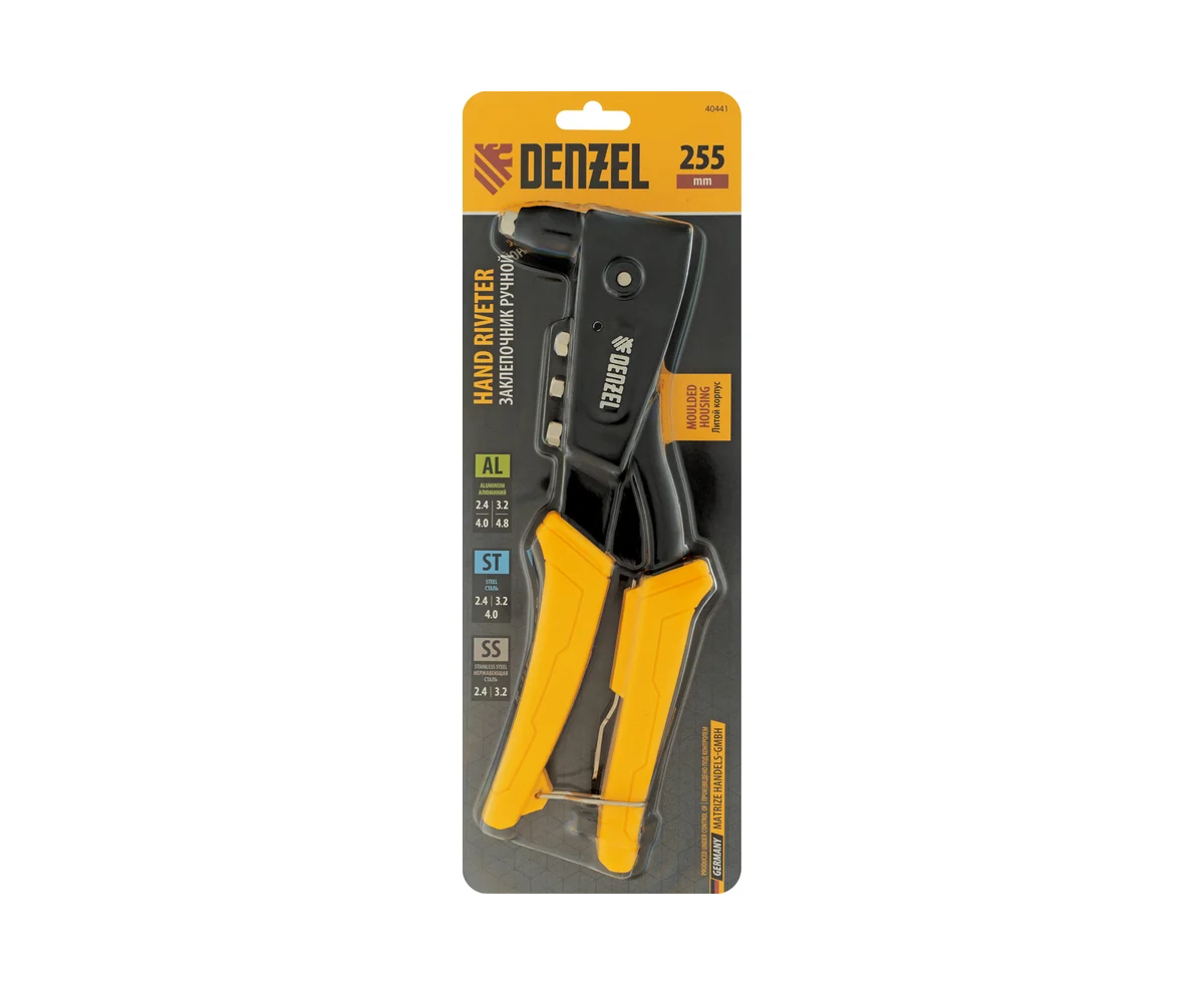 Усиленный ручной заклепочник Denzel 40441 длиной 255 мм, с литым корпусом, предназначен для работы с алюминиевыми вытяжными заклепками диаметром 2,4-3,2-4,0-4,8 мм, стальными диаметром 2,4-3,2-4,0 мм и вытяжными заклепками из «нержавейки» диаметром 2,4-3,2 мм. Инструмент позволяет соединять листовые металлические заготовки, металлопрофиль и легкие конструкции небольшой толщины. Используется для проведения строительных, ремонтных и монтажных работ как в быту, так и в профессиональной сфере.