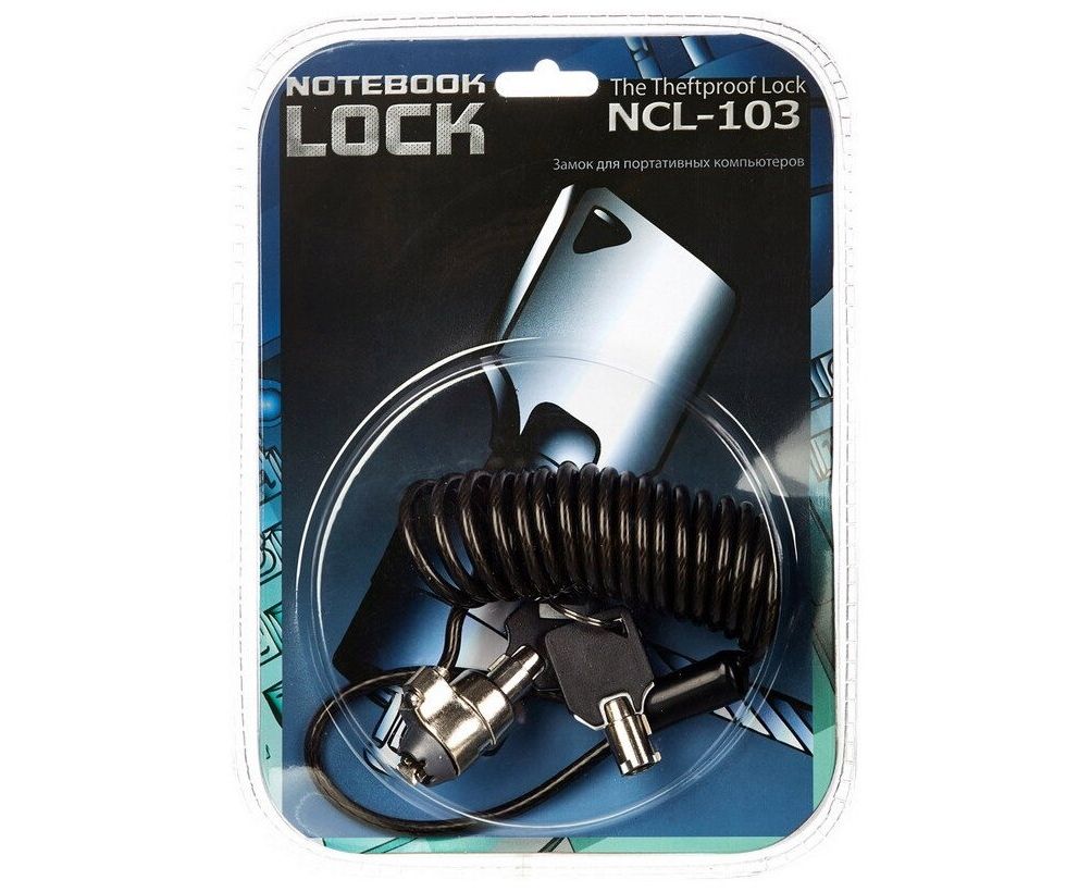 Запирающее кабельное устройство NCL-103 для ноутбука. Необходимо обмотать стальной трос вокруг какого-либо неподвижного предмета - например, ножки шкафа и подключить трос к замку. В комплекте два ключа. Устанавливается трос безопасности как правило, в гнездо безопасности ноутбука Kensington lock.