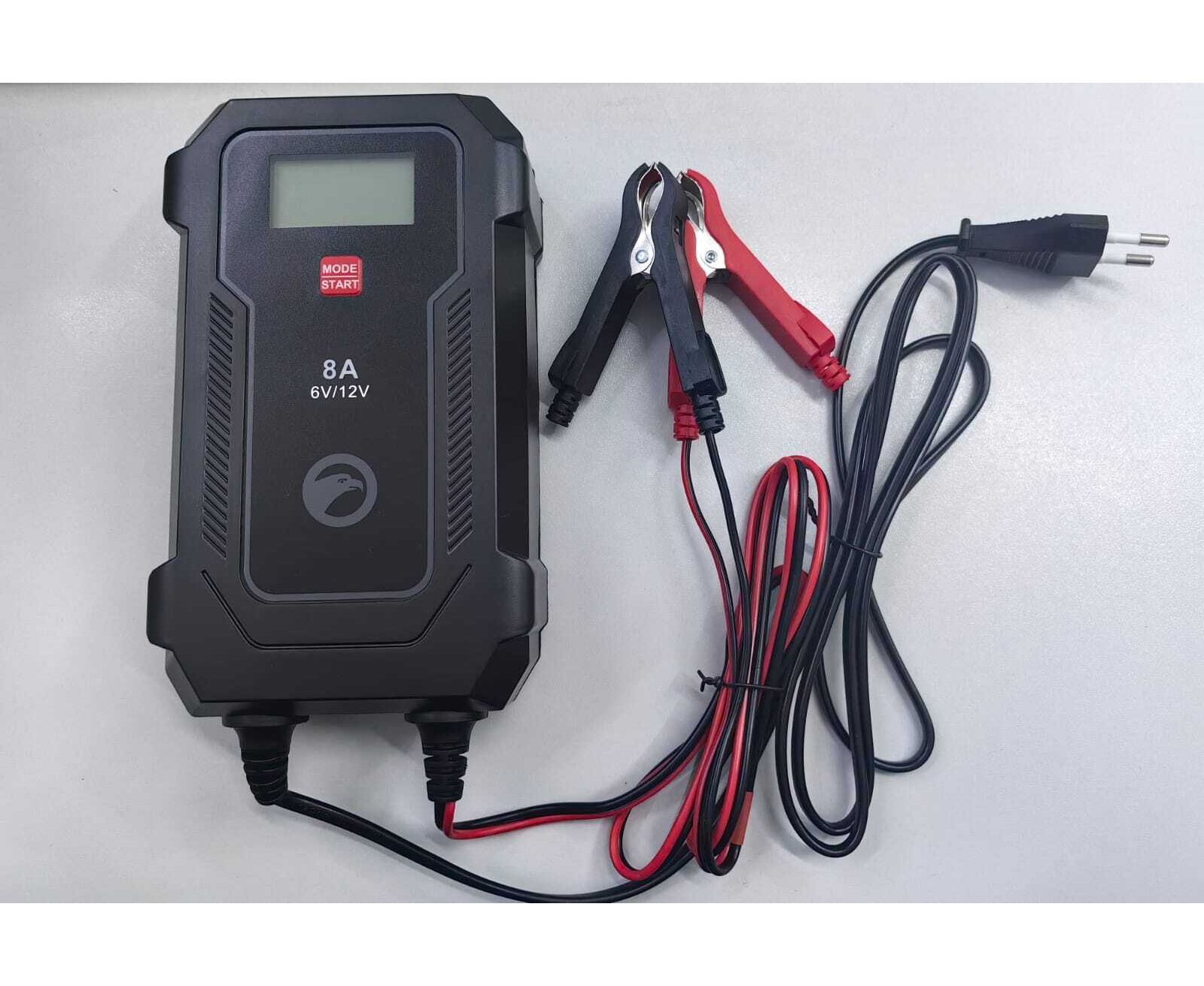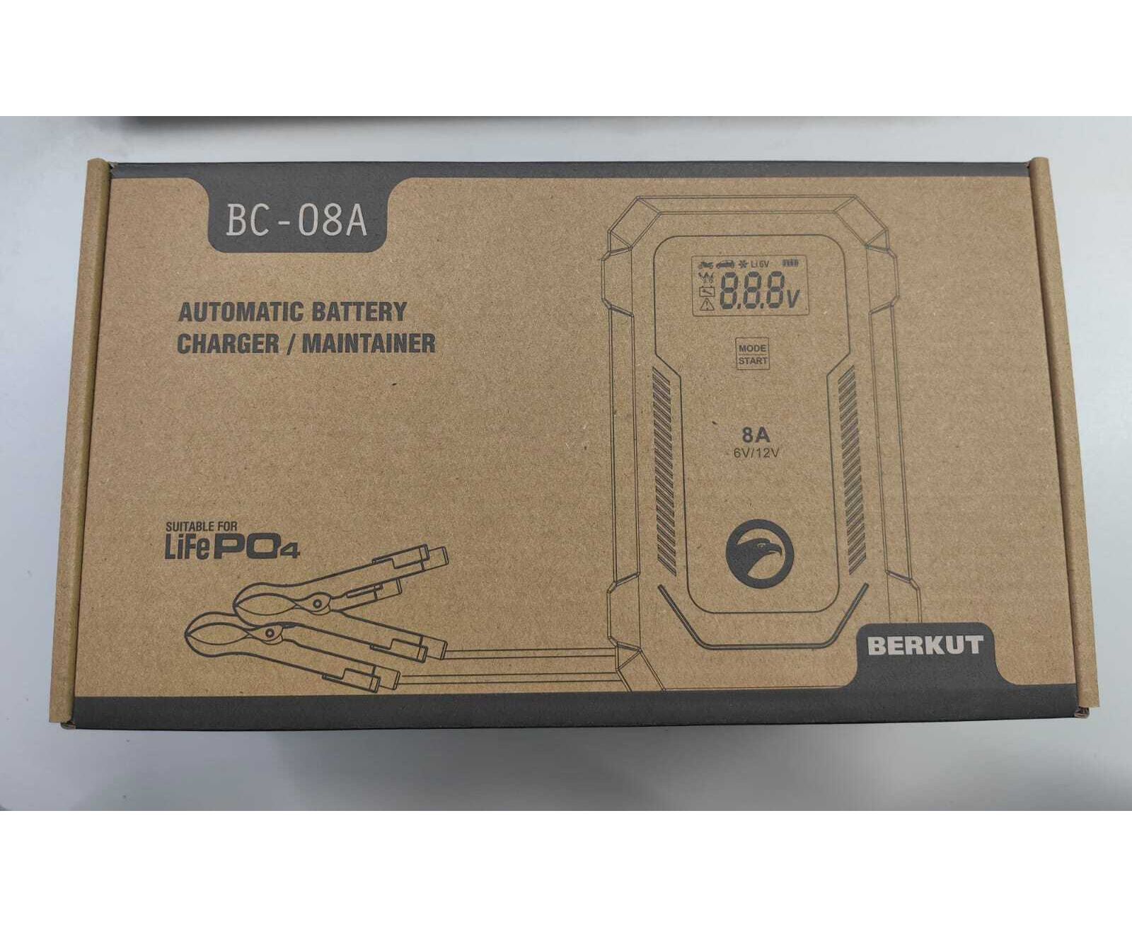 Зарядное устройство BERKUT BC-08A— полностью автоматическое устройство, предназначенное для обслуживания и зарядки 6 и 12-Вольтовых аккумуляторных батарей емкостью от 4 до 120 Ач, используемых в мото- и садовой техники и т.п. Устройство является полностью автоматическим и имеет поэтапный поэтапным алгоритмом зарядки в 9 стадий.