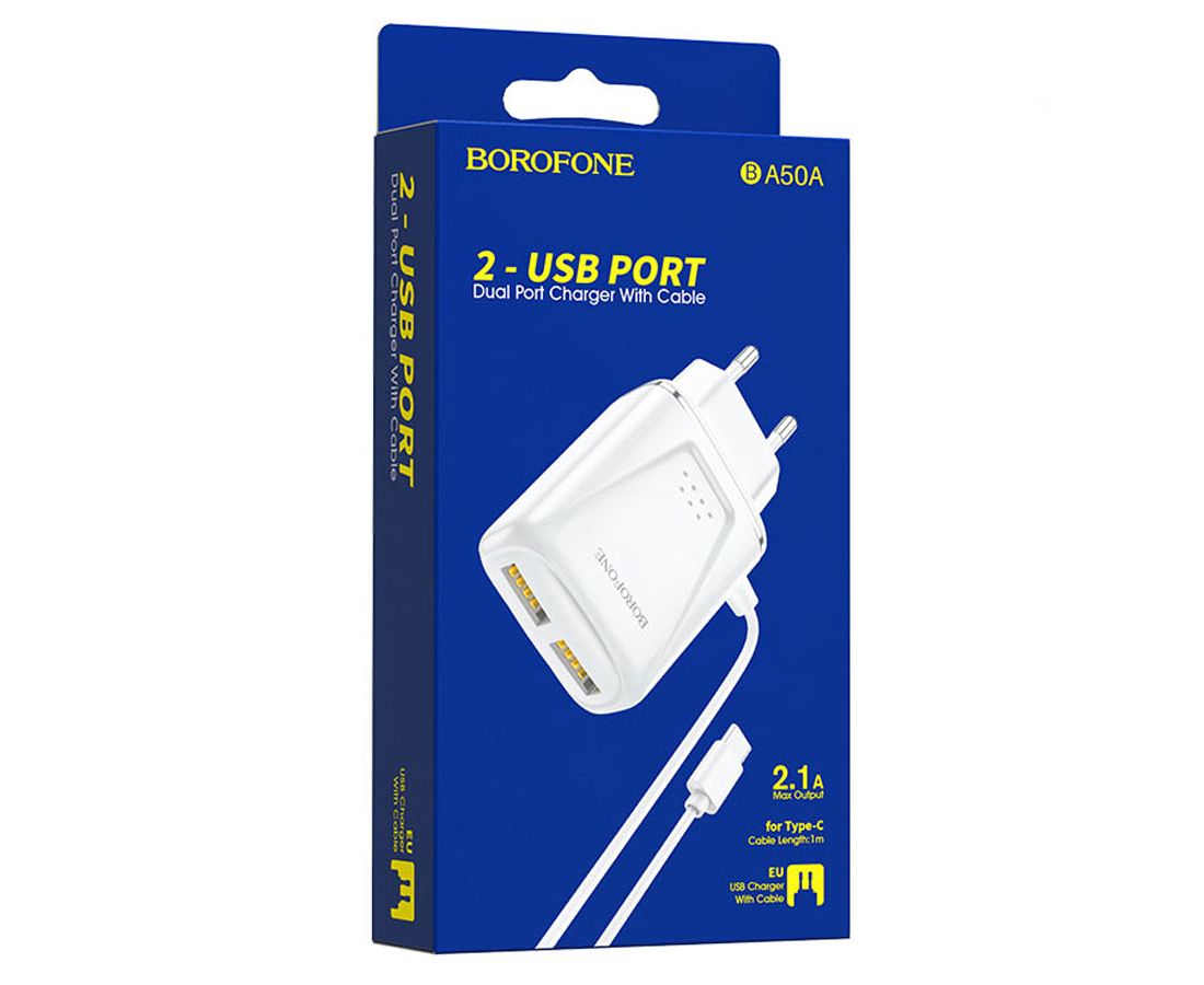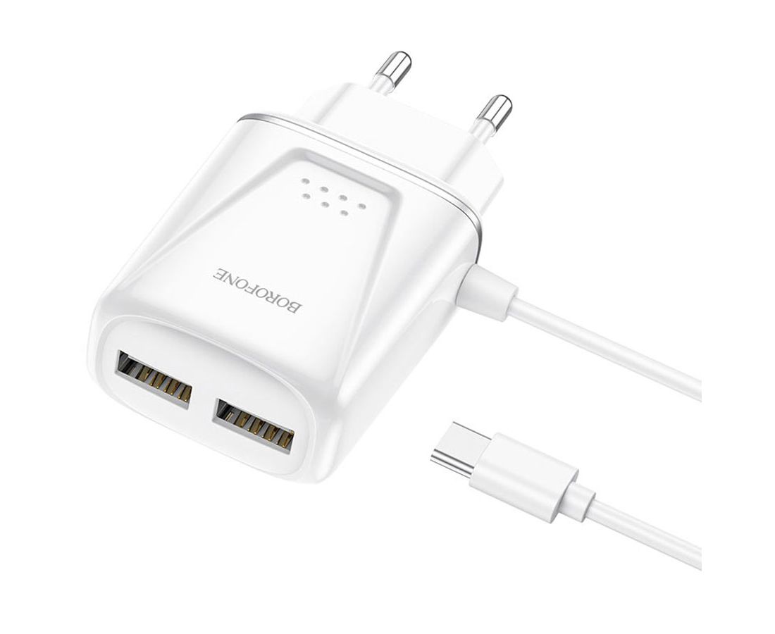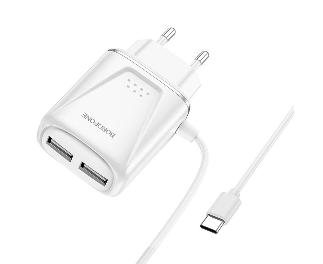 Сетевое зарядное устройство BOROFONE BA50A Beneficence 2xUSB с Кабелем Type-C, 2.1A, белый