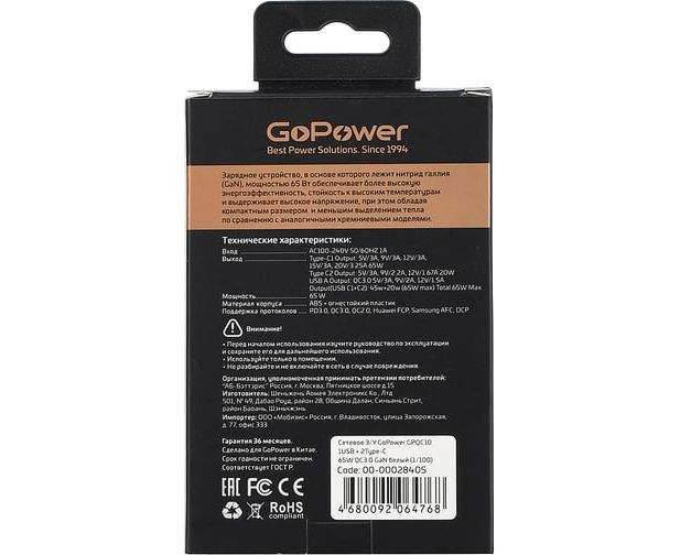 Зарядное устройство нового поколения GoPower GPQC10 создано для максимально быстрой и безопасной зарядки ваших устройств - телефона, планшета, наушников, повербанков и многих других гаджетов. Инновационная технология GaN на базе нитрида галлия позволяет быстро зарядить любые совместимые гаджеты, включая аудио и фото технику.