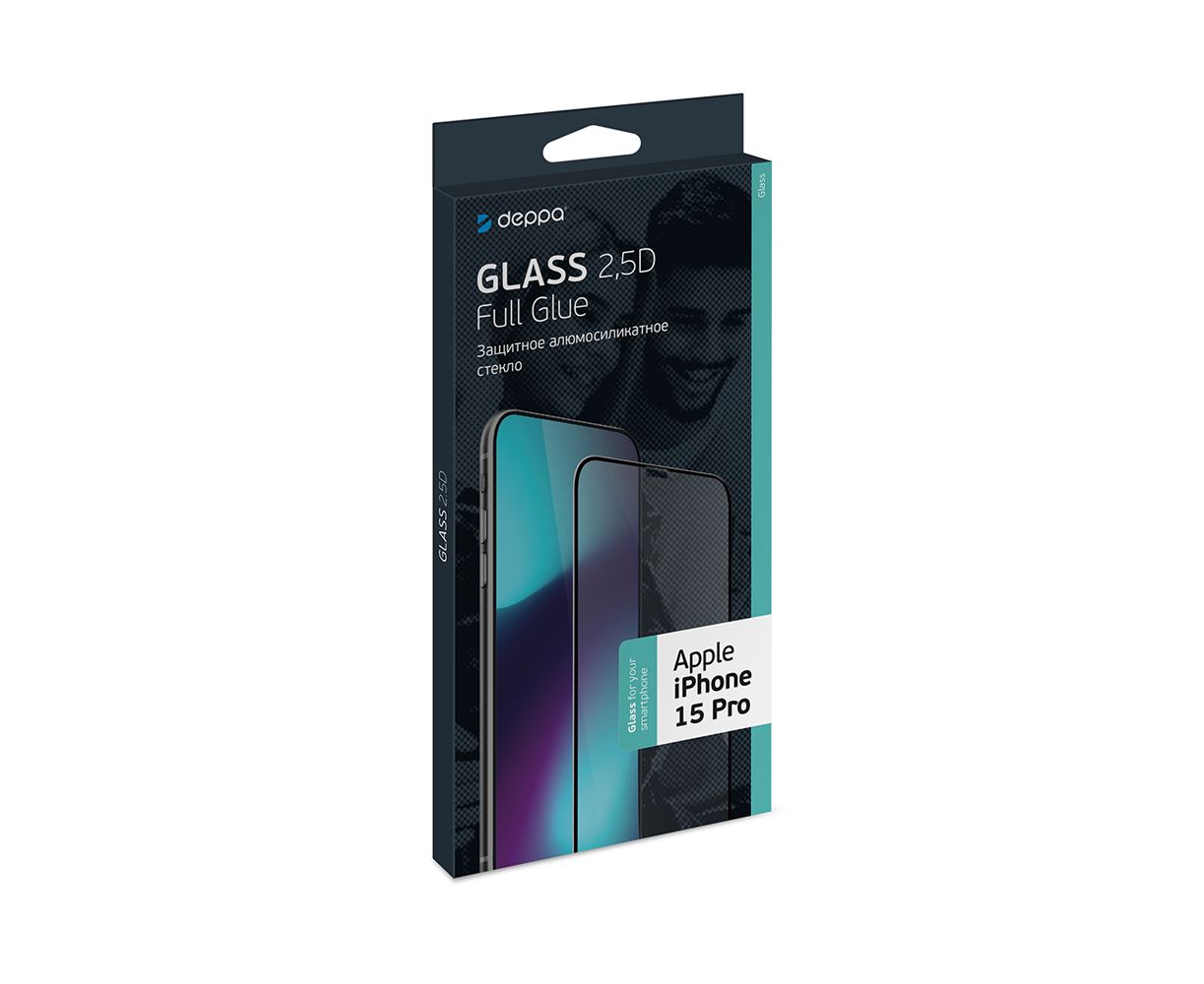 Защитное стекло 2,5D Classic Full Glue для Apple iPhone 15 Pro, 0.3 мм, черная рамка, прозрачное, Deppa, 62950