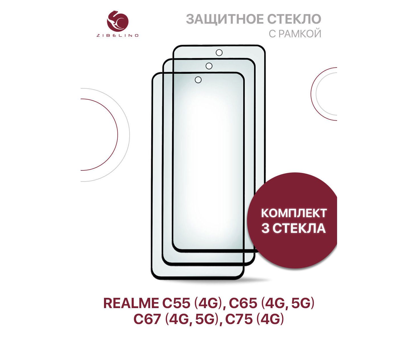 Защитное стекло (Комплект 3 шт) для Realme C75 (4g), C65 (4g/5g), C67 (4g/5g), C55 (4g) с черной рамкой, с вырезом для камеры (Реалми С55 С65 С67)