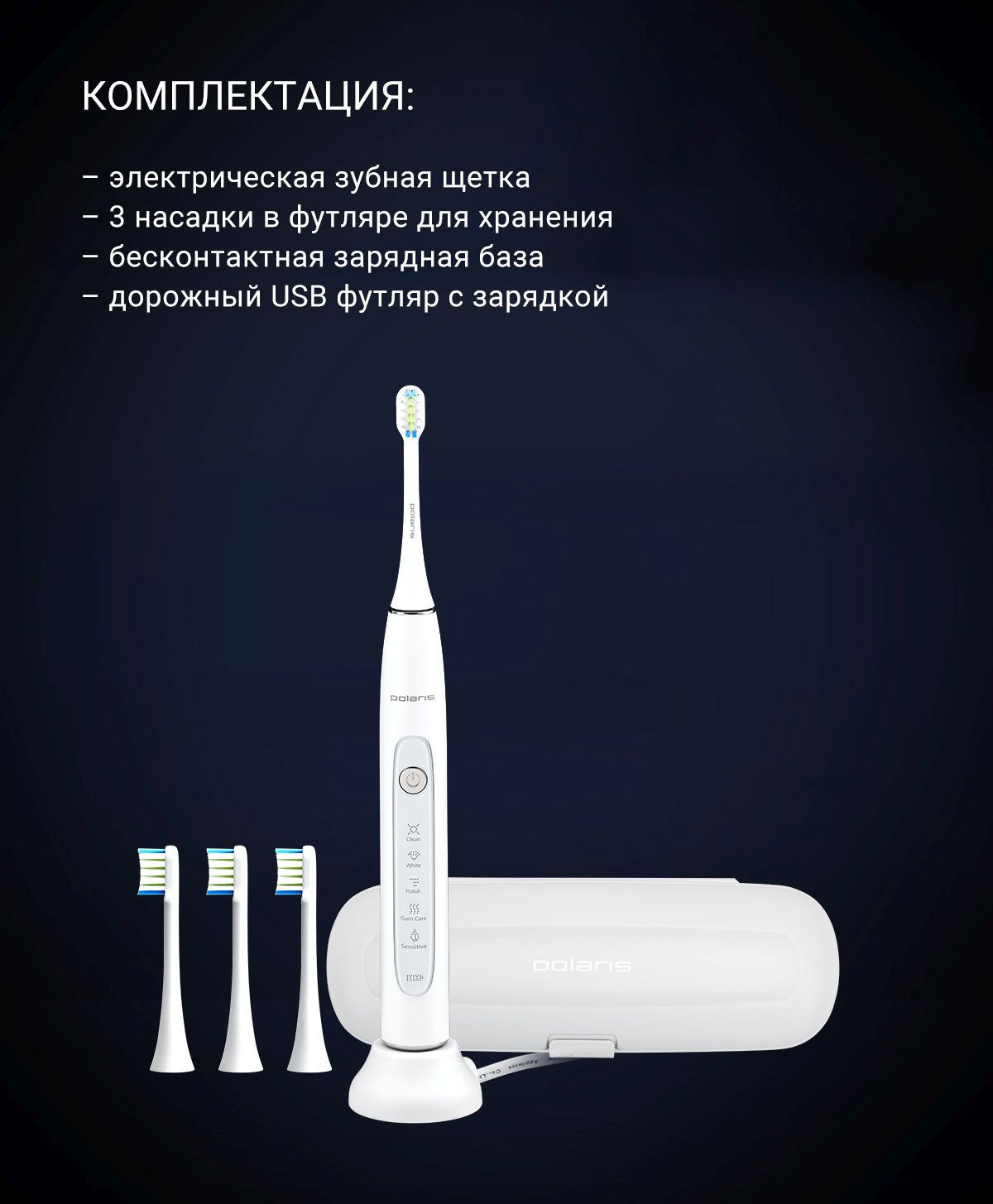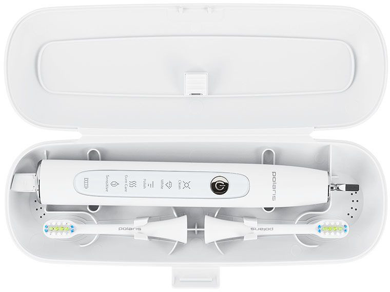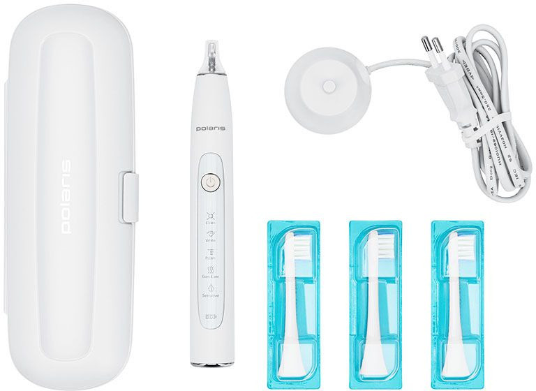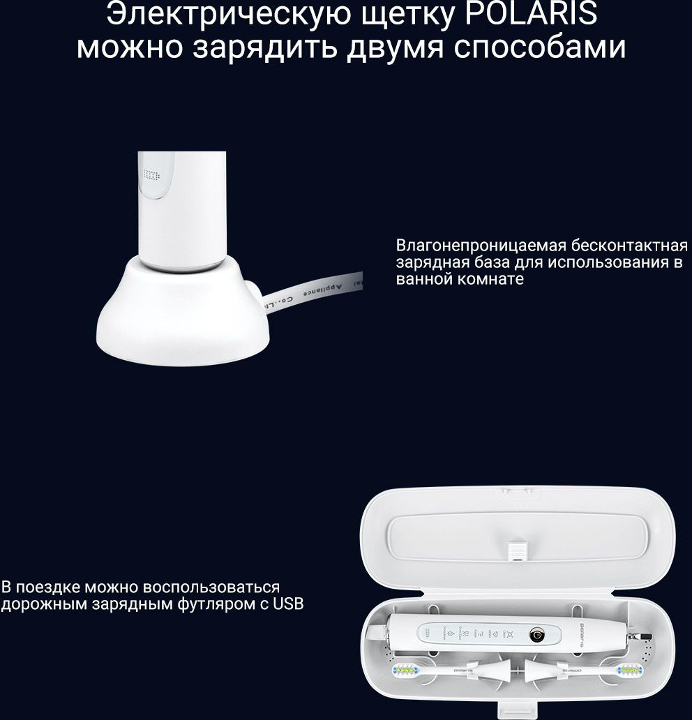 Описание: Электрическая зубная щетка Polaris PETB 0503 с уровнем влагозащиты IPX7 работает до 60 дней работы без подзарядки в режиме Sensitive. Имеется футляр для путешествий и беспроводное зарядное устройство. Автоматическое отключение через 2 минуты.